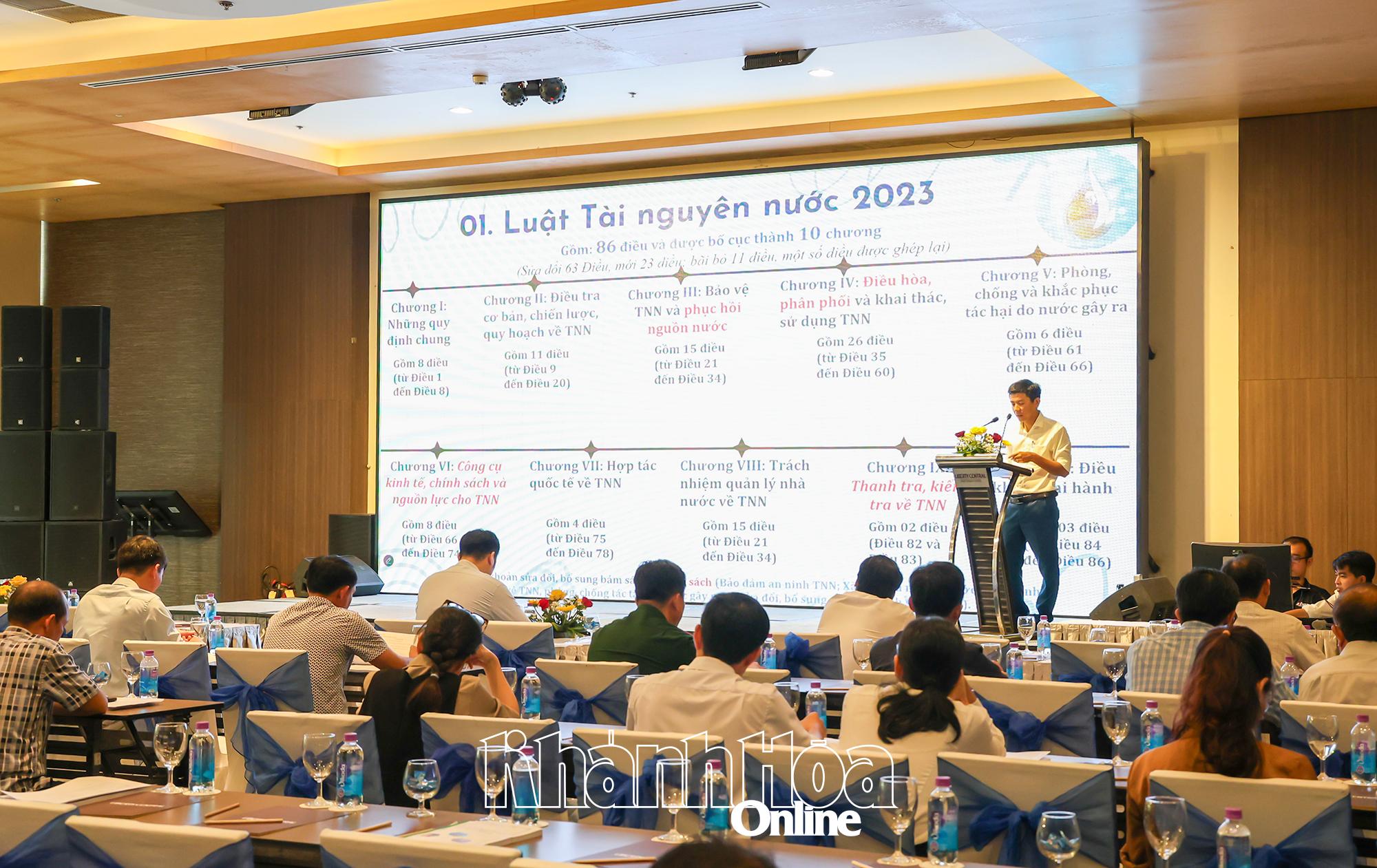 Tại hội nghị, các báo cáo viên đã giới thiệu những nội dung trọng tâm của Luật Tài nguyên nước năm 2023, như: Nguyên tắc quản lý tổng hợp tài nguyên nước theo lưu vực sông; bảo đảm khai thác, sử dụng hợp lý, tiết kiệm, hiệu quả, công bằng và bền vững; quy định rõ trách nhiệm của cơ quan quản lý, chính quyền địa phương, tổ chức, cá nhân trong việc bảo vệ, khai thác, sử dụng nguồn nước. Bên cạnh đó, các đại biểu cũng được phổ biến về cơ chế cấp phép, giám sát khai thác, xả thải; quy định về bảo vệ hành lang an toàn nguồn nước, bảo đảm an ninh, an toàn công trình thủy lợi và hồ chứa nước.