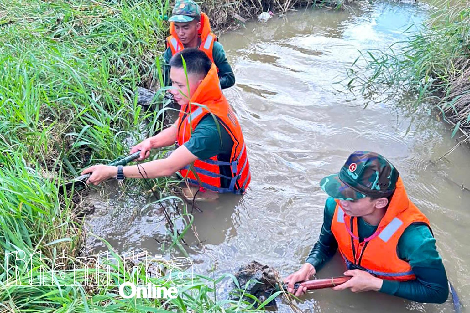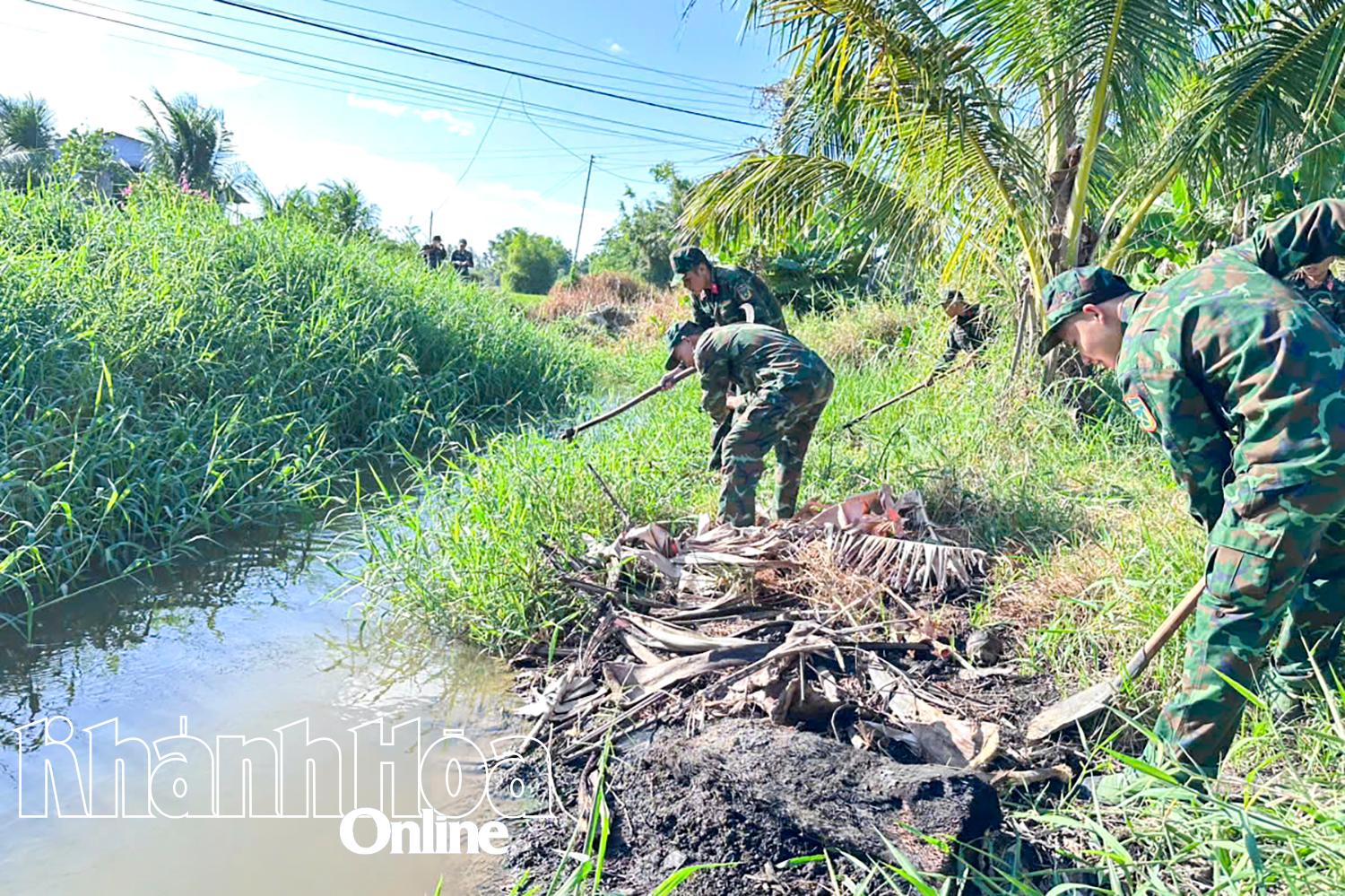 | Cán bộ, chiến sĩ tích cực giúp dân nạo vét kênh mương nội đồng. |