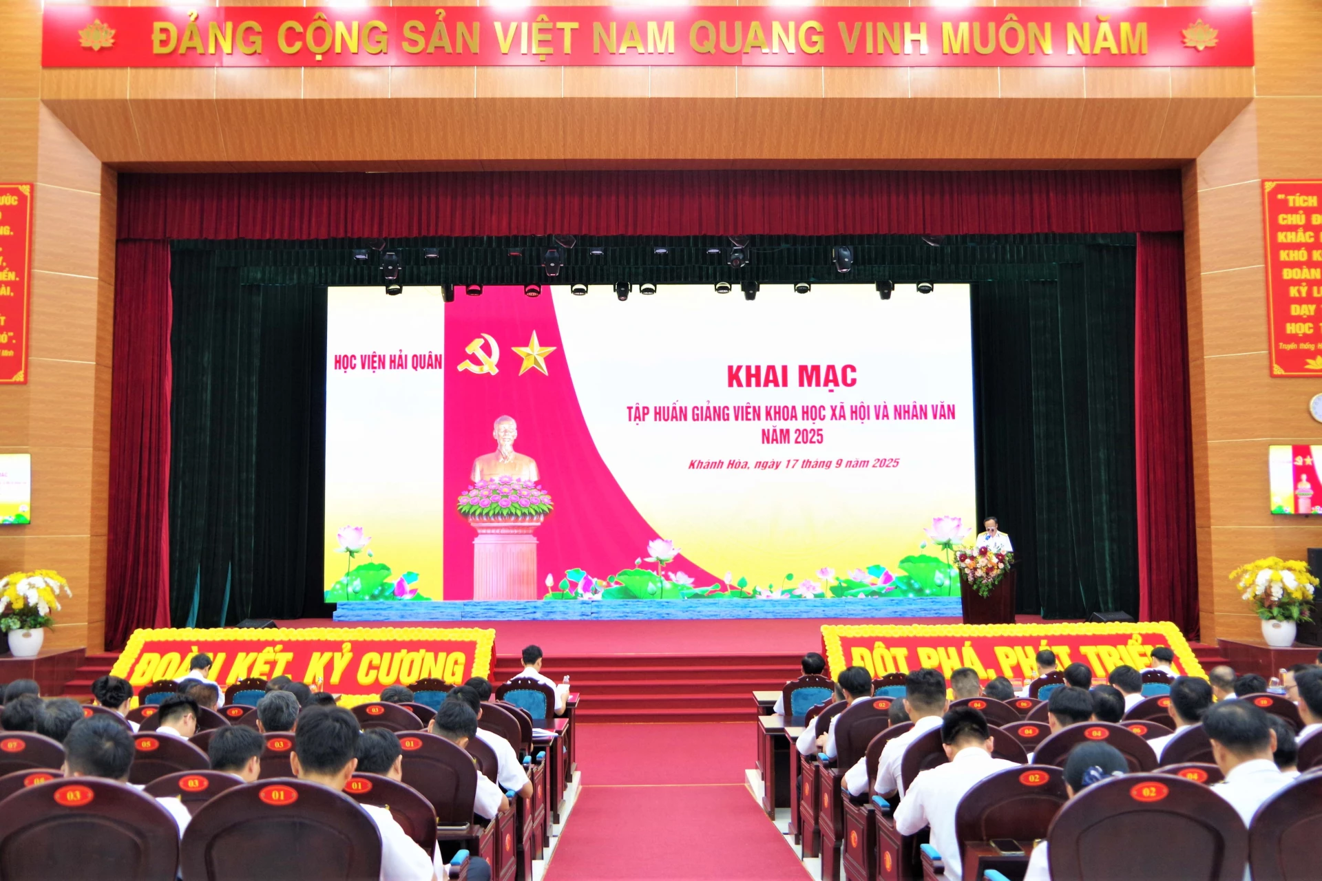Chiều 17-9, Học viện Hải quân tổ chức tập huấn giảng viên khoa học xã hội và nhân văn năm 2025. Chuẩn Đô đốc Nguyễn Hữu Thoan - Chính ủy Học viện dự tập huấn.