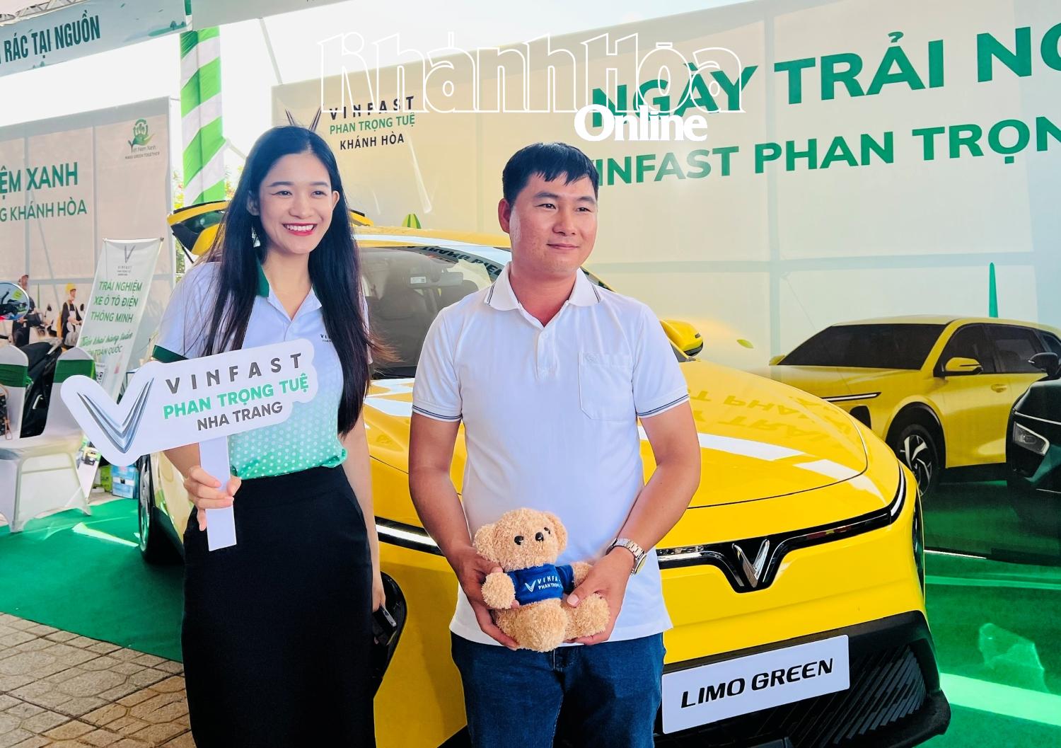 | Khách hàng nhận quà tặng sau khi đăng ký chạy thử xe ô tô điện của Vinfast. |