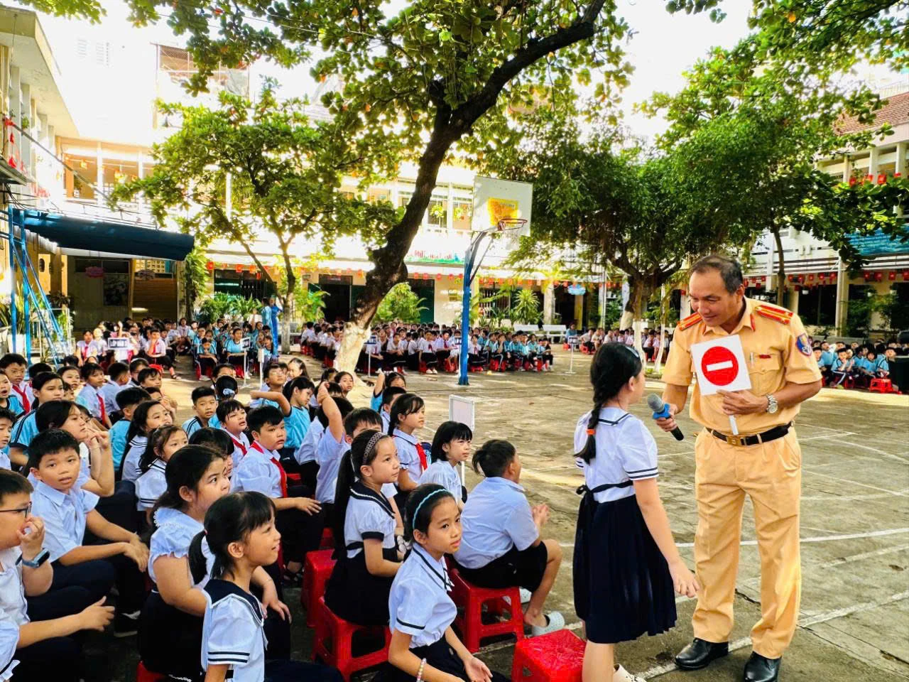 | Cán bộ Phòng Cảnh sát giao thông đặt các câu hỏi tình huống để học sinh tham gia trả lời. |