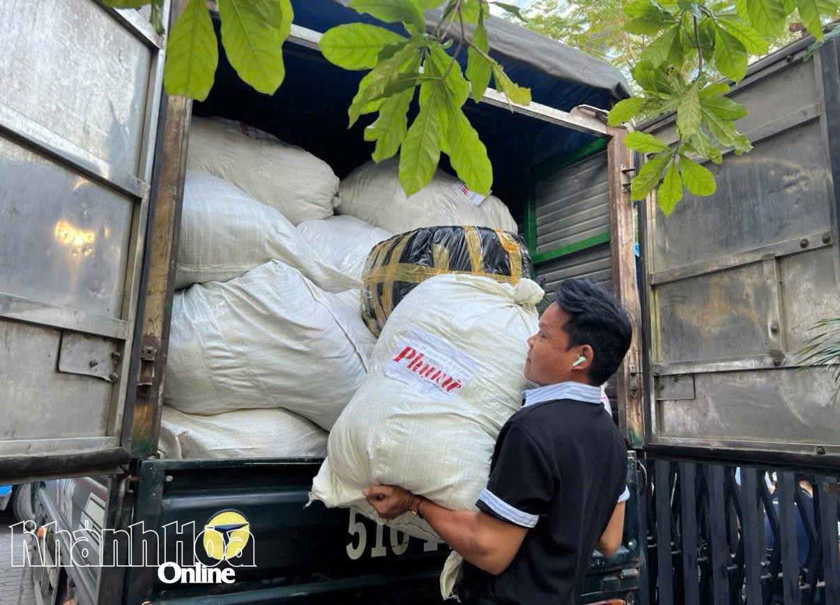 | Hàng hóa được Báo Phụ nữ TP. Hồ Chí Minh vận chuyển lên xe để gửi đến Khánh Hòa. |