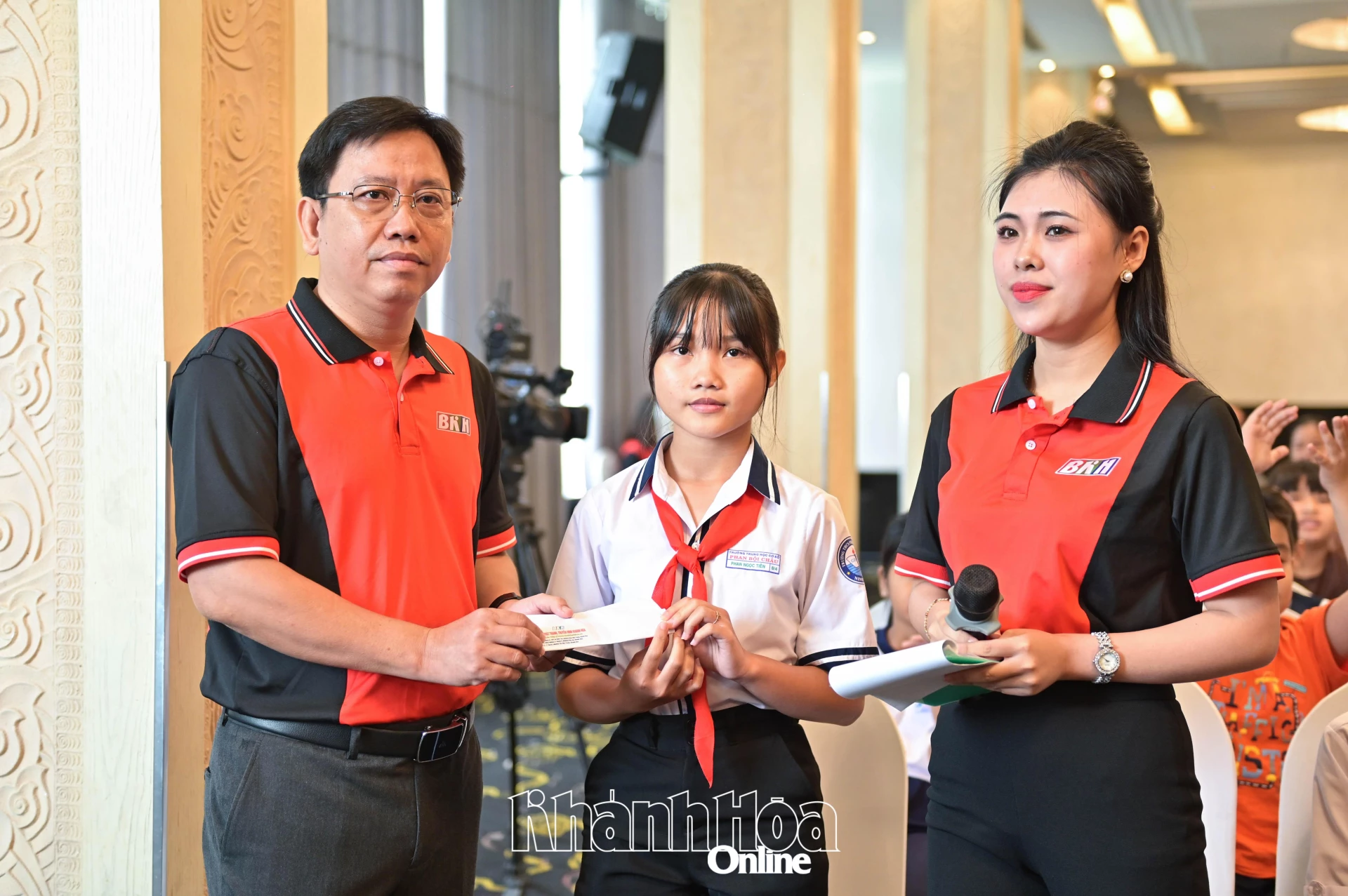 | Ông Cung Phú Quốc - Phó Giám đốc Báo và Phát thanh, Truyền hình Khánh Hòa trao hỗ trợ 10 triệu đồng cho học sinh bị mồ côi cha sau đợt mưa lũ. |