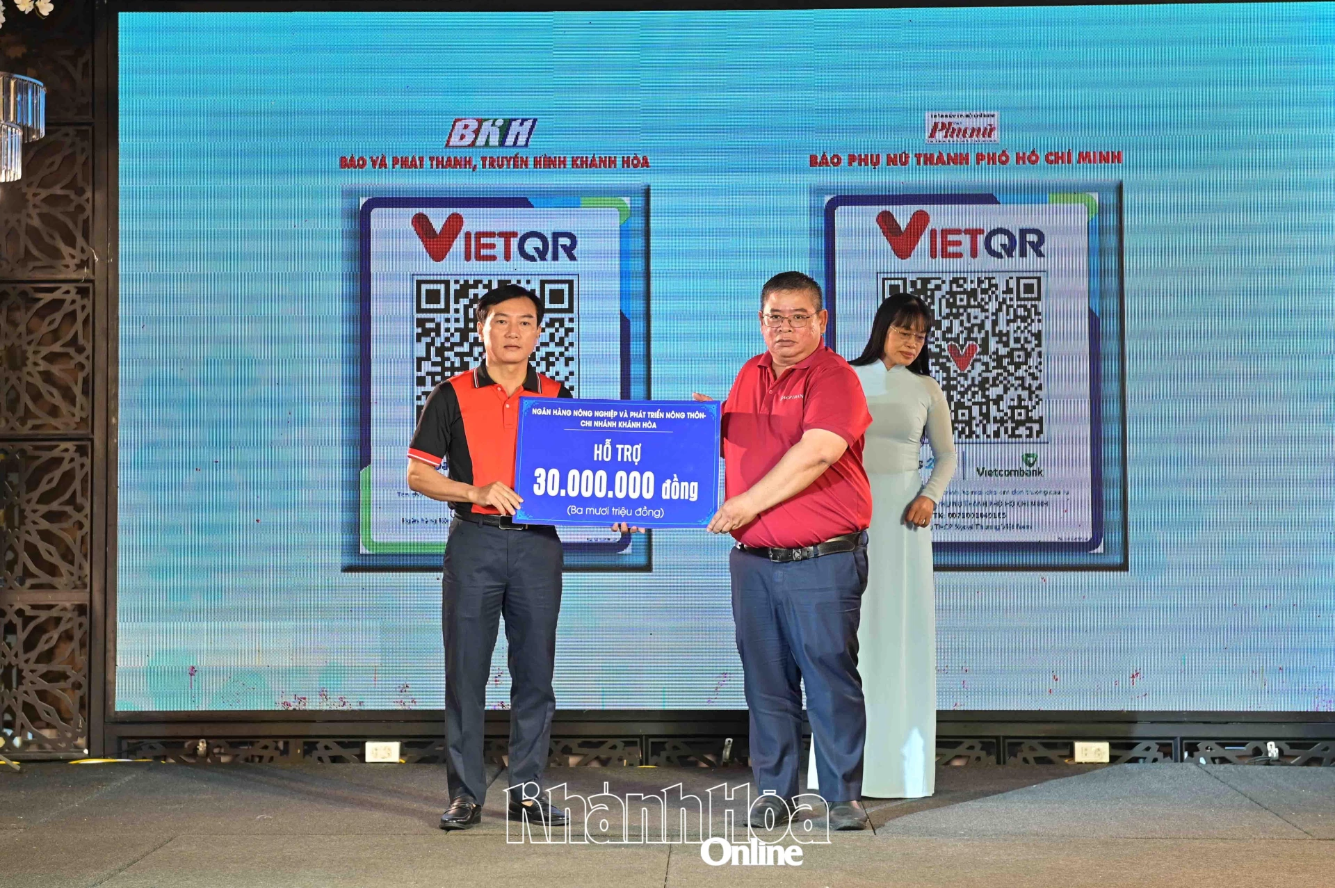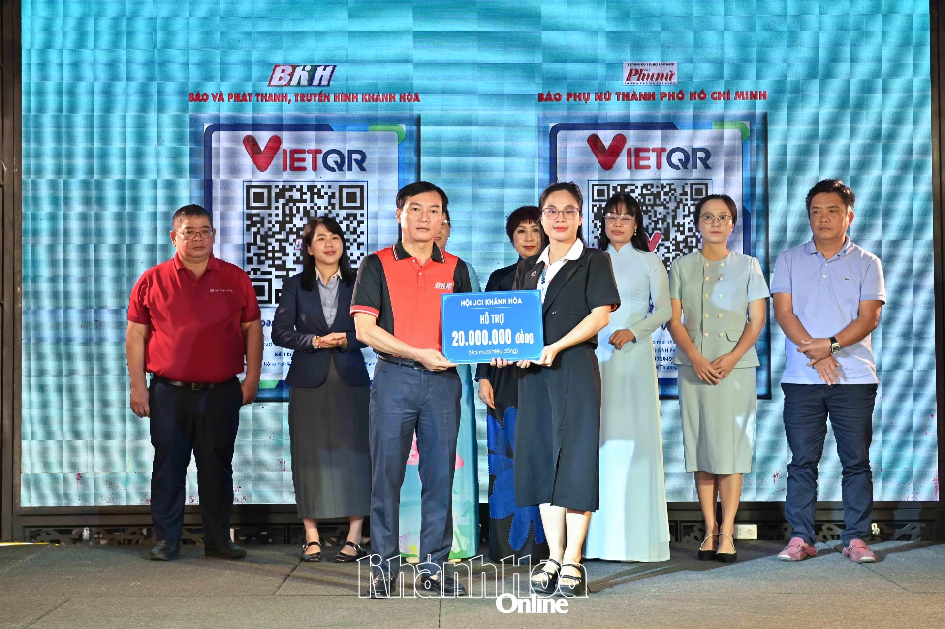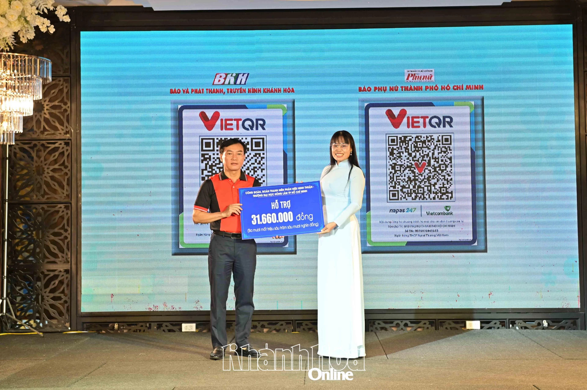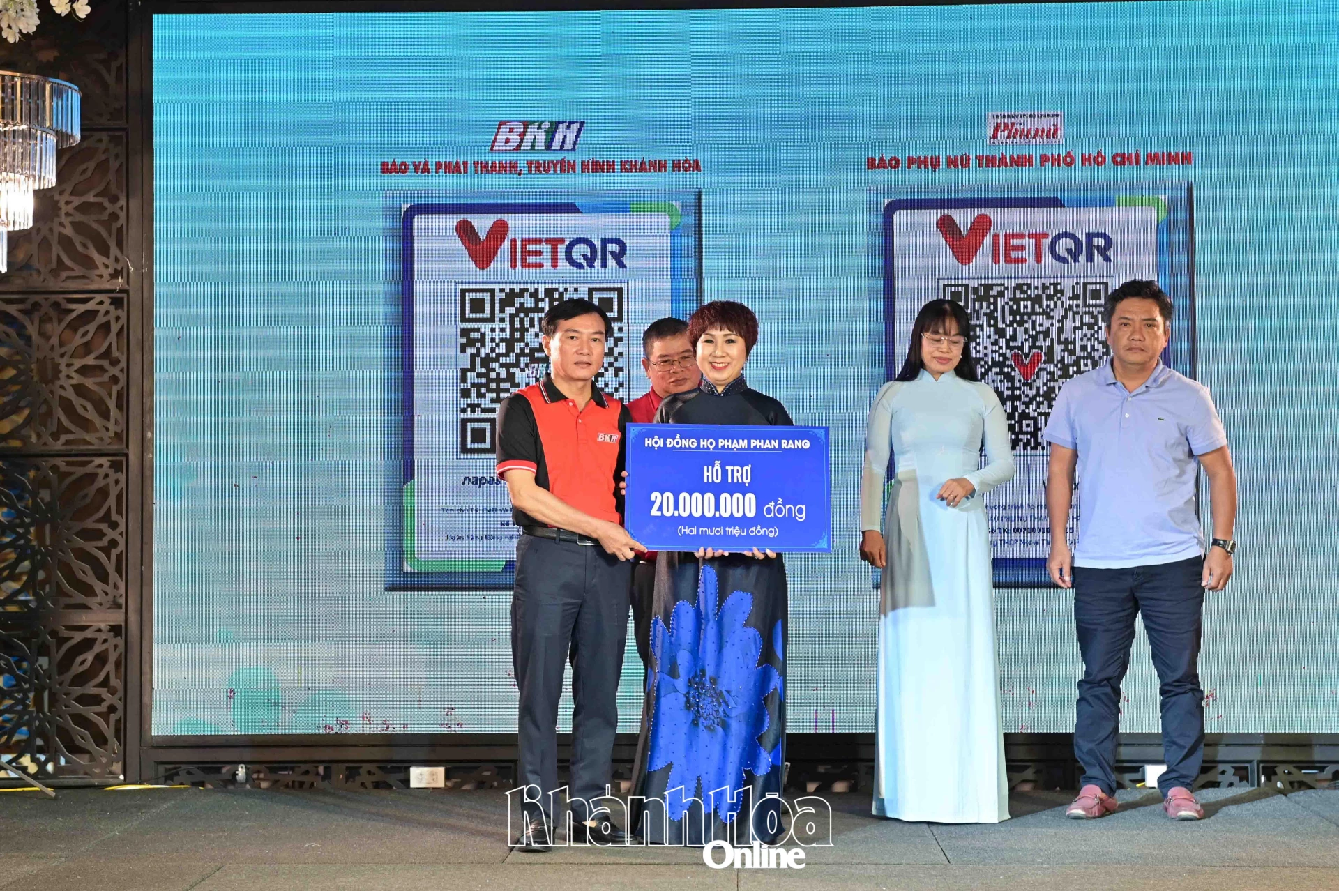 | Lãnh đạo Báo và Phát thanh, Truyền hình Khánh Hòa tiếp nhận bảng tượng trưng kinh phí ủng hộ tại chương trình. |