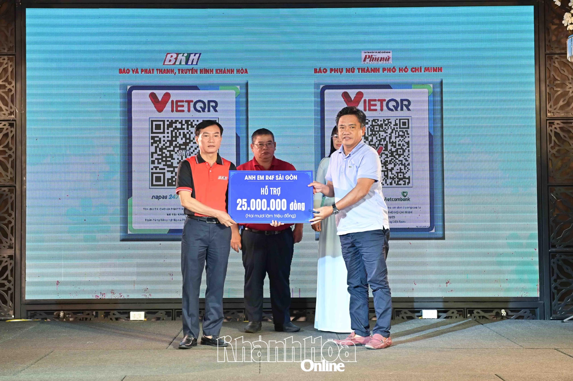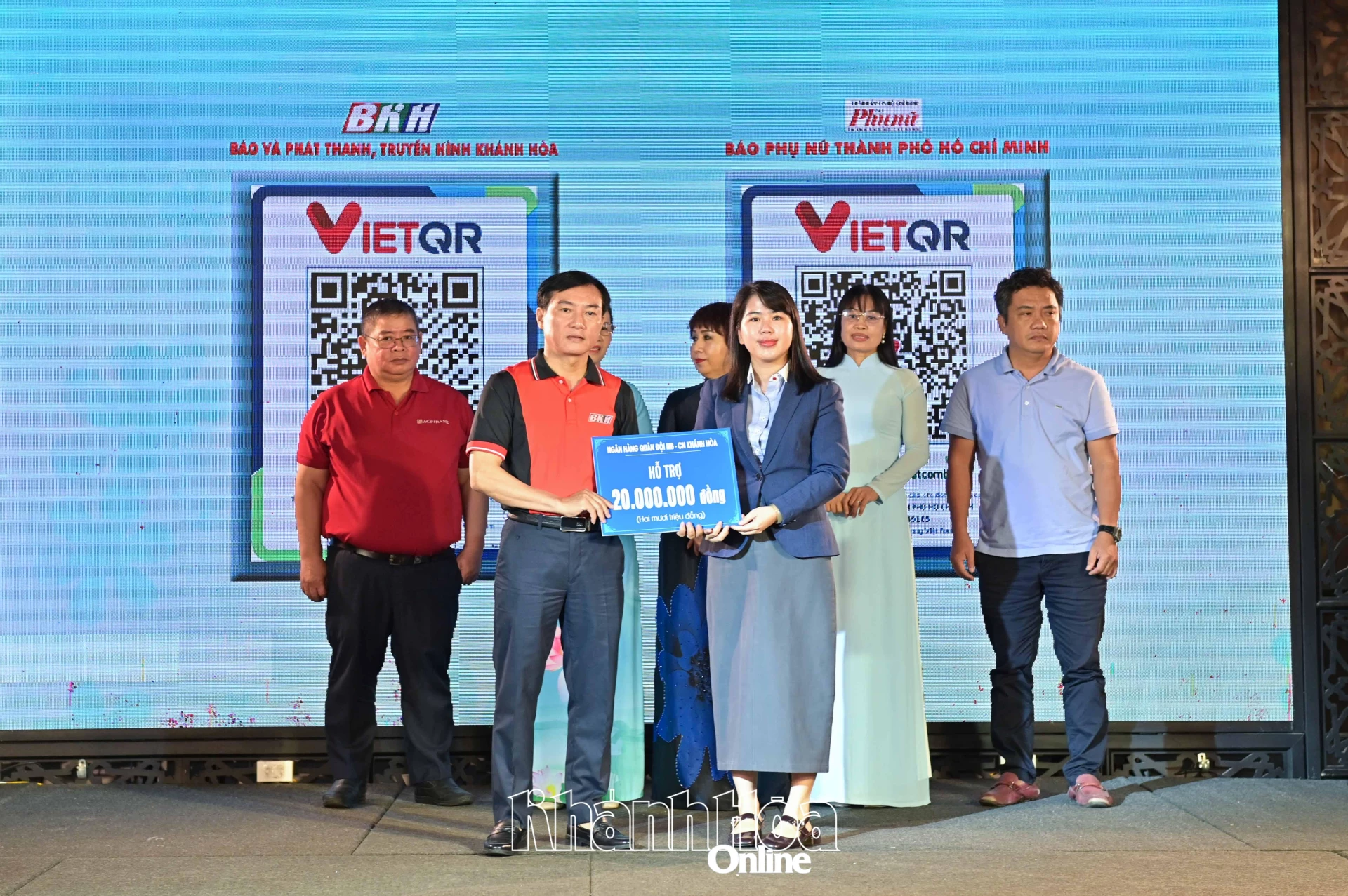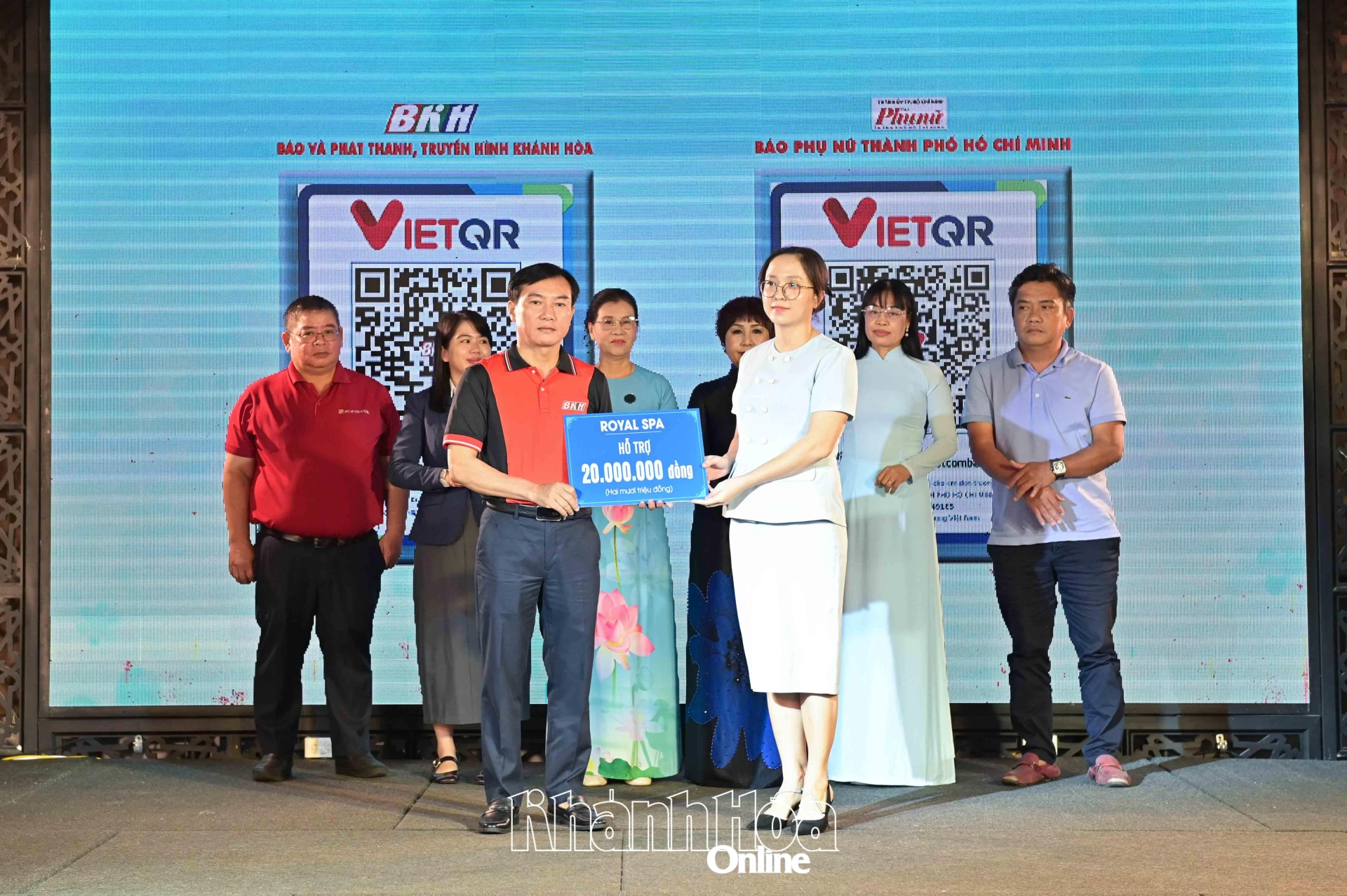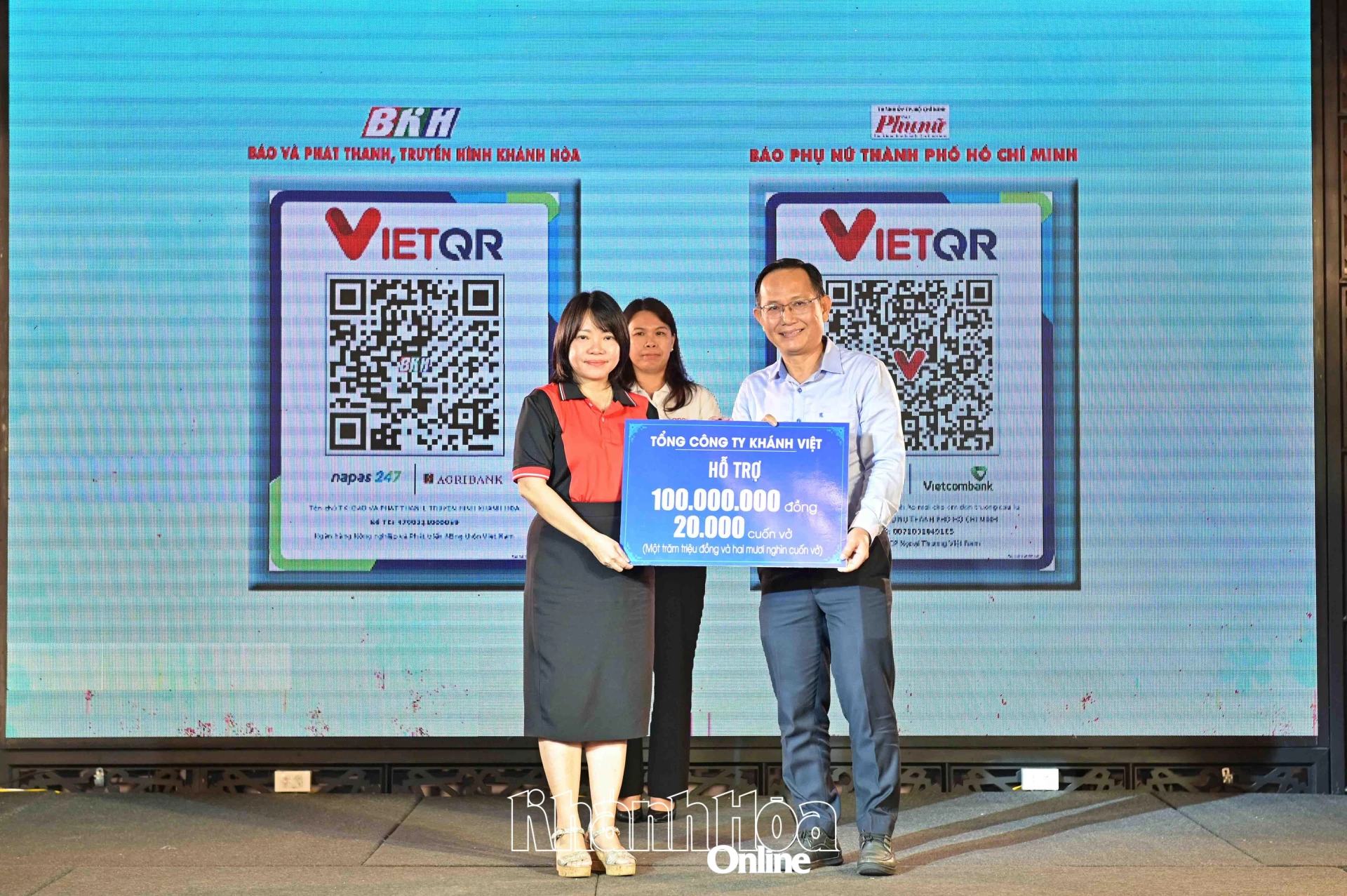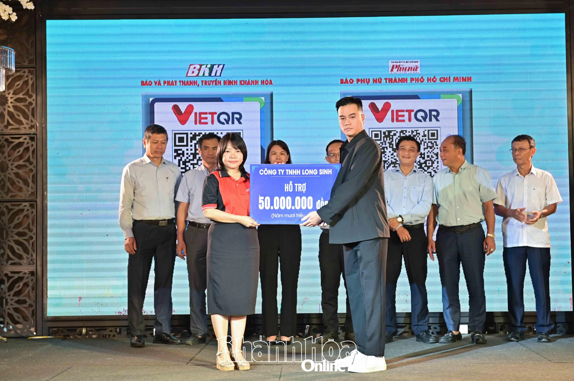 | Lãnh đạo Báo và Phát thanh, Truyền hình Khánh Hòa tiếp nhận bảng tượng trưng kinh phí ủng hộ tại chương trình. |