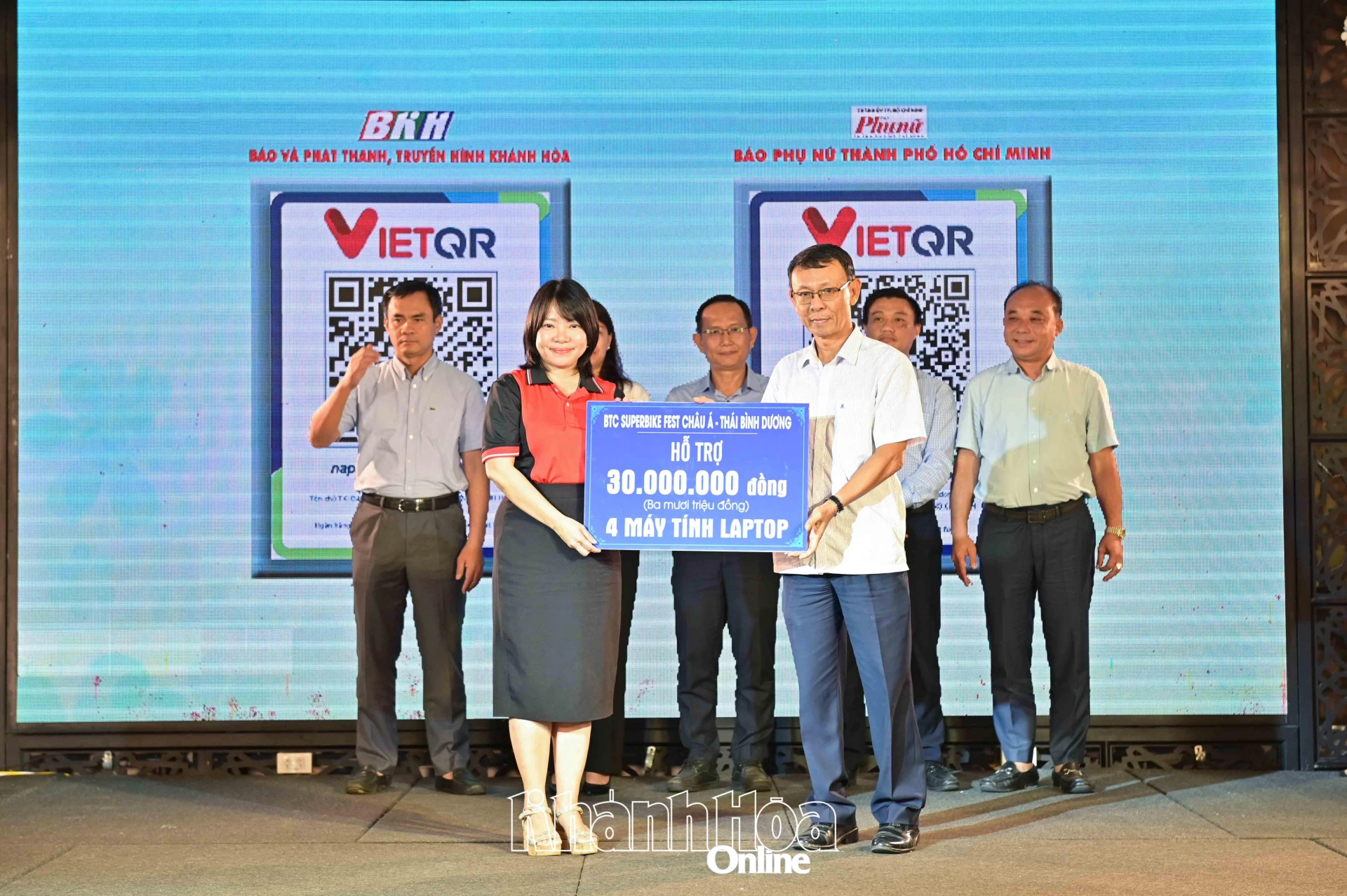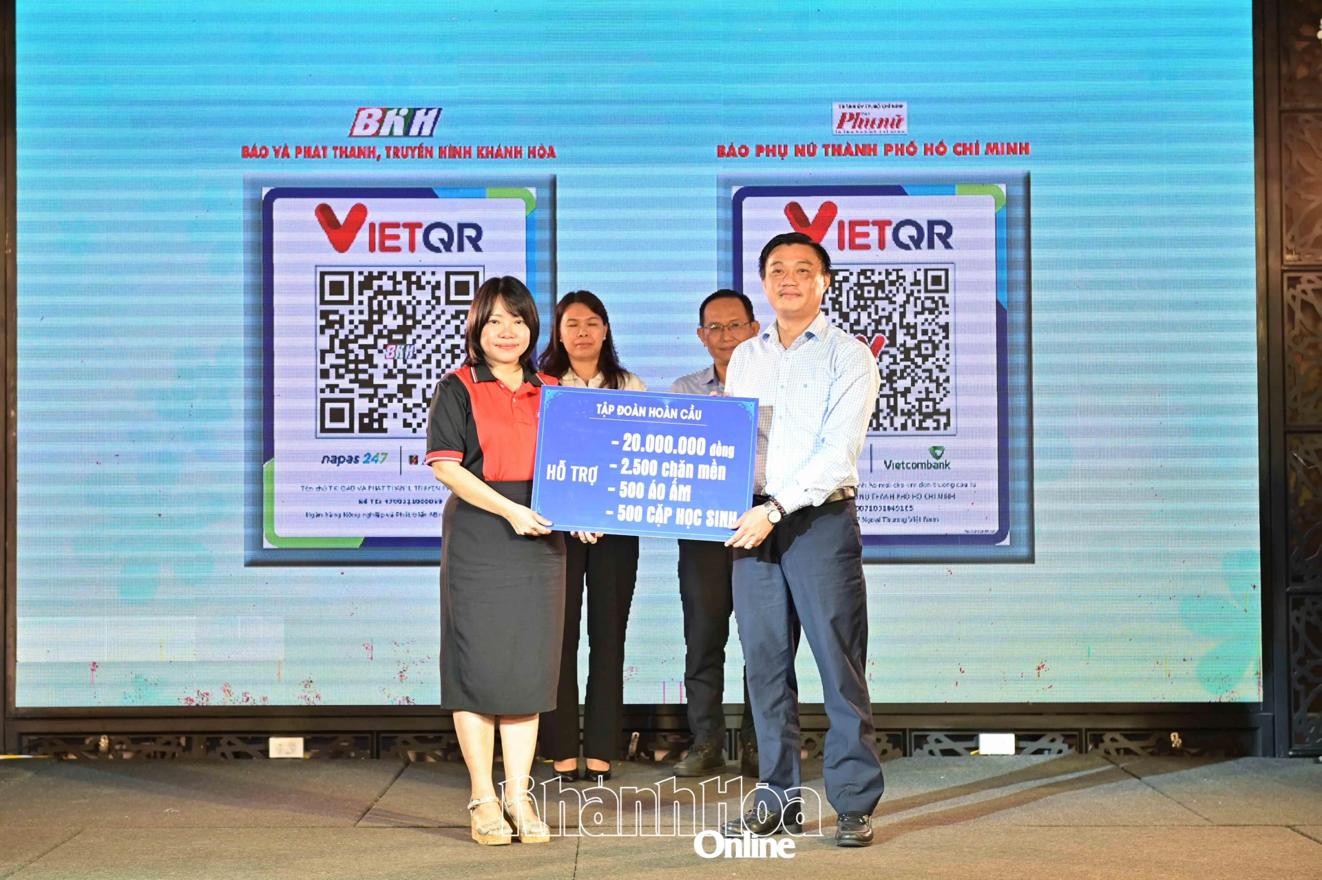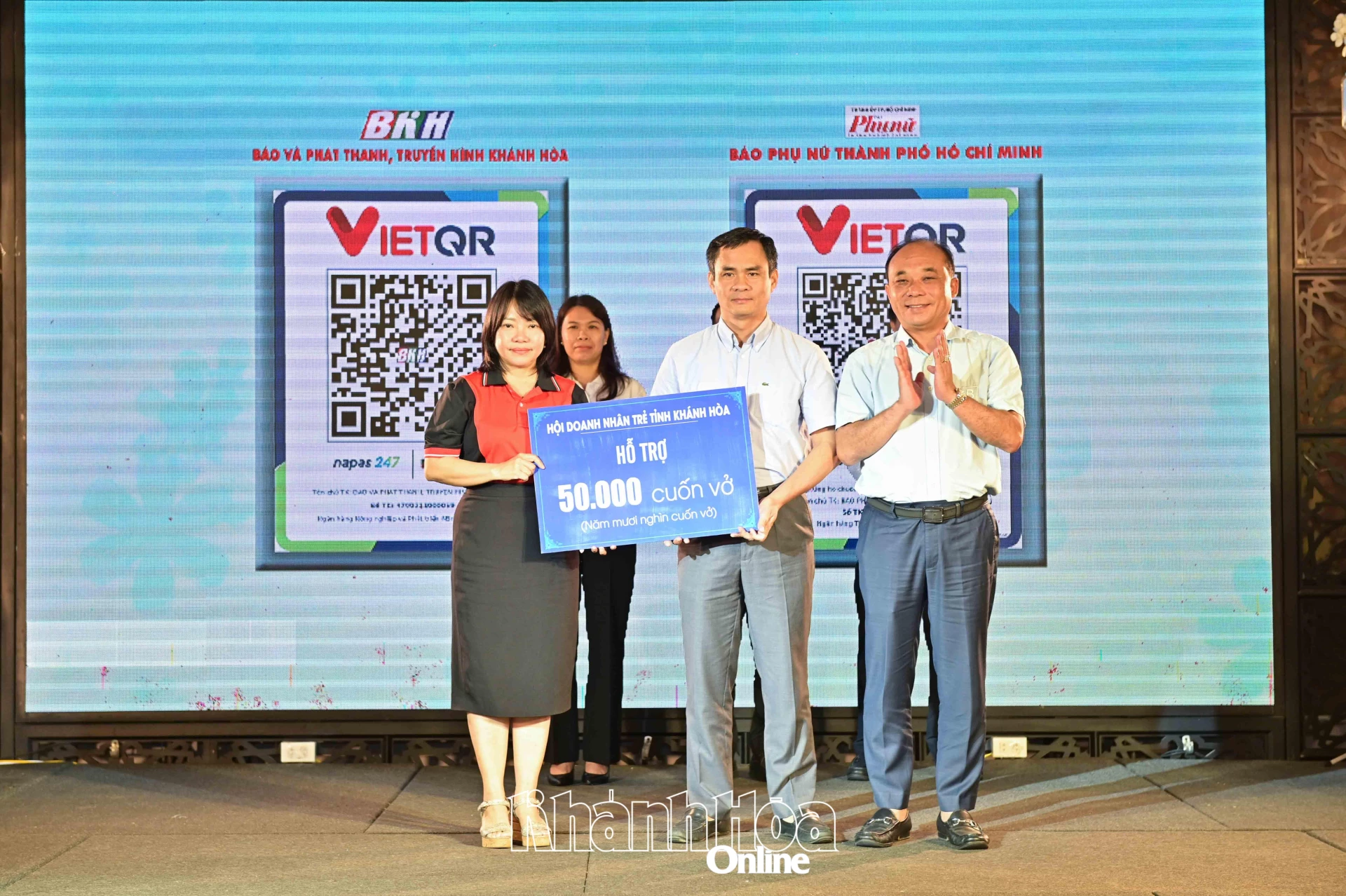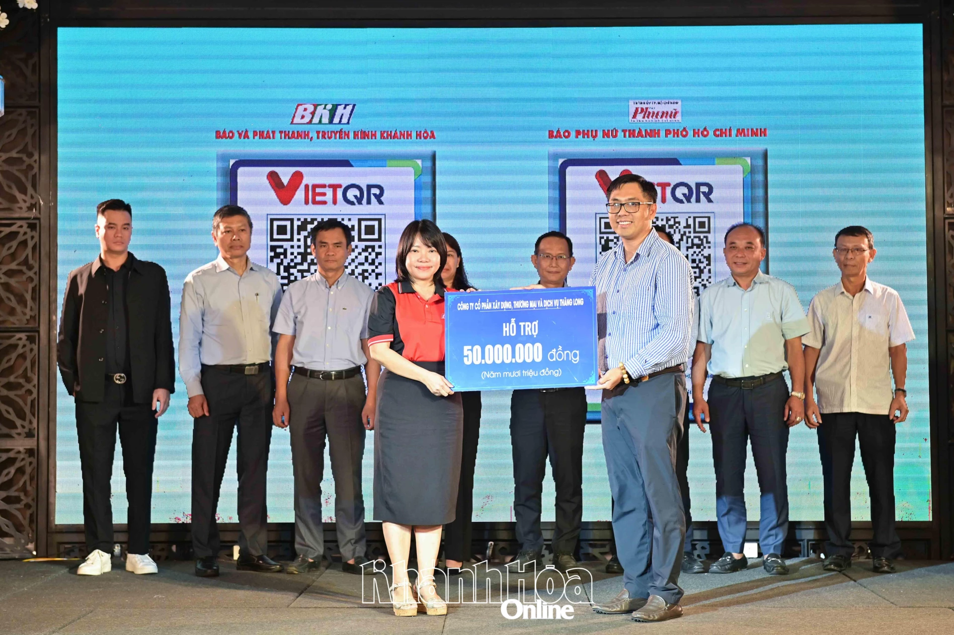 | Lãnh đạo Báo và Phát thanh, Truyền hình Khánh Hòa tiếp nhận bảng tượng trưng kinh phí ủng hộ tại chương trình. |