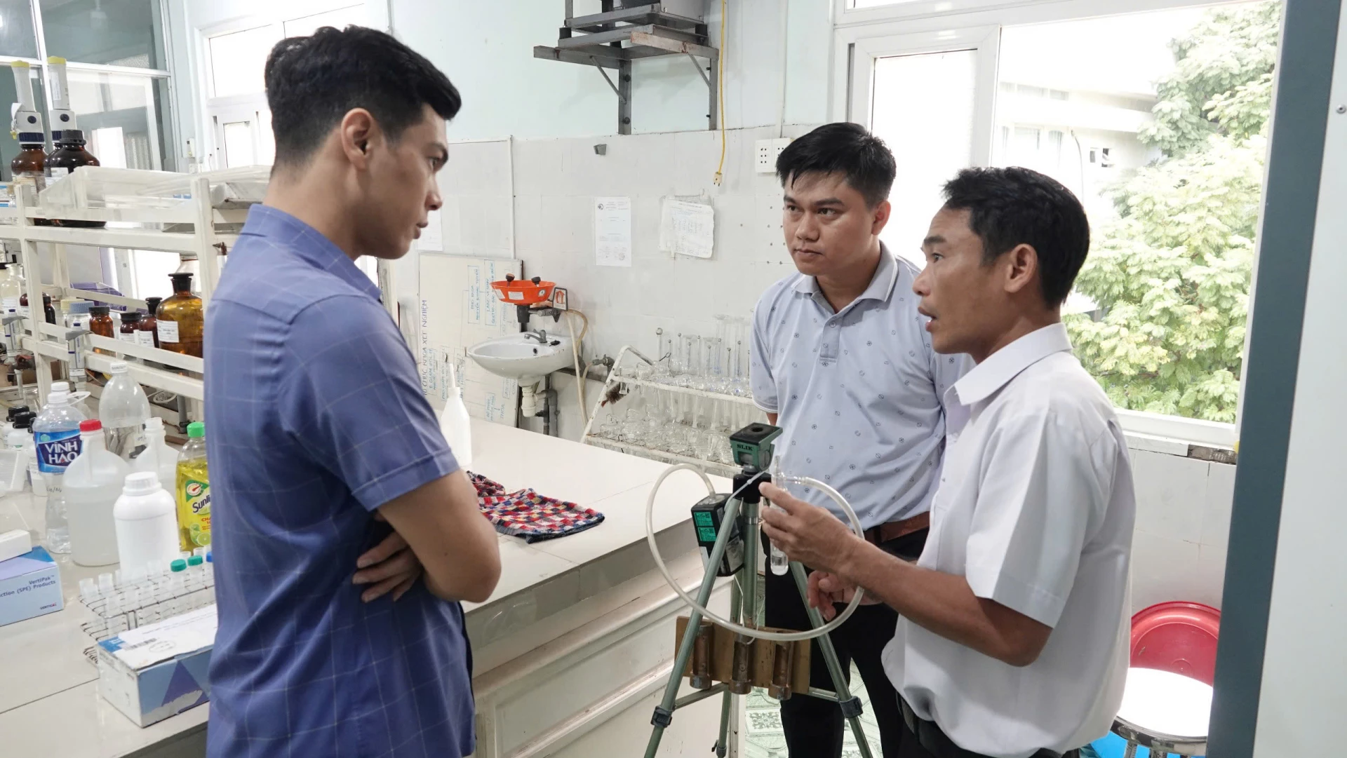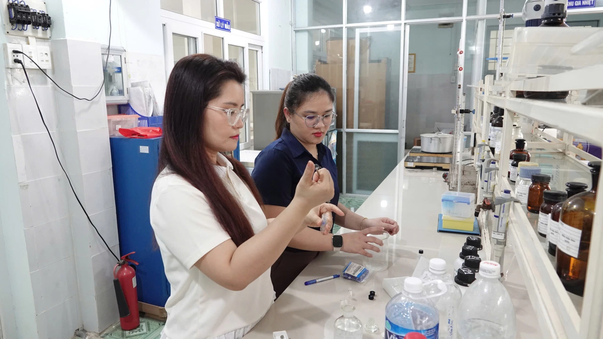 | Cán bộ Viện Pasteur Nha Trang hướng dẫn sử dụng hóa chất chuẩn. |