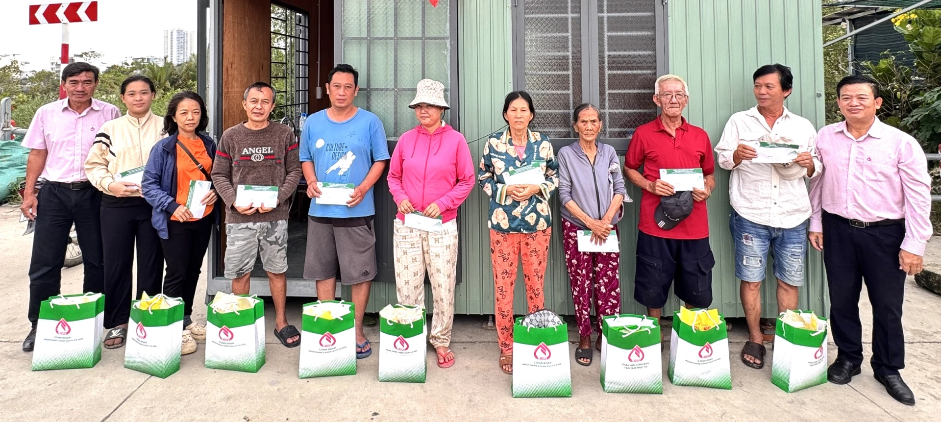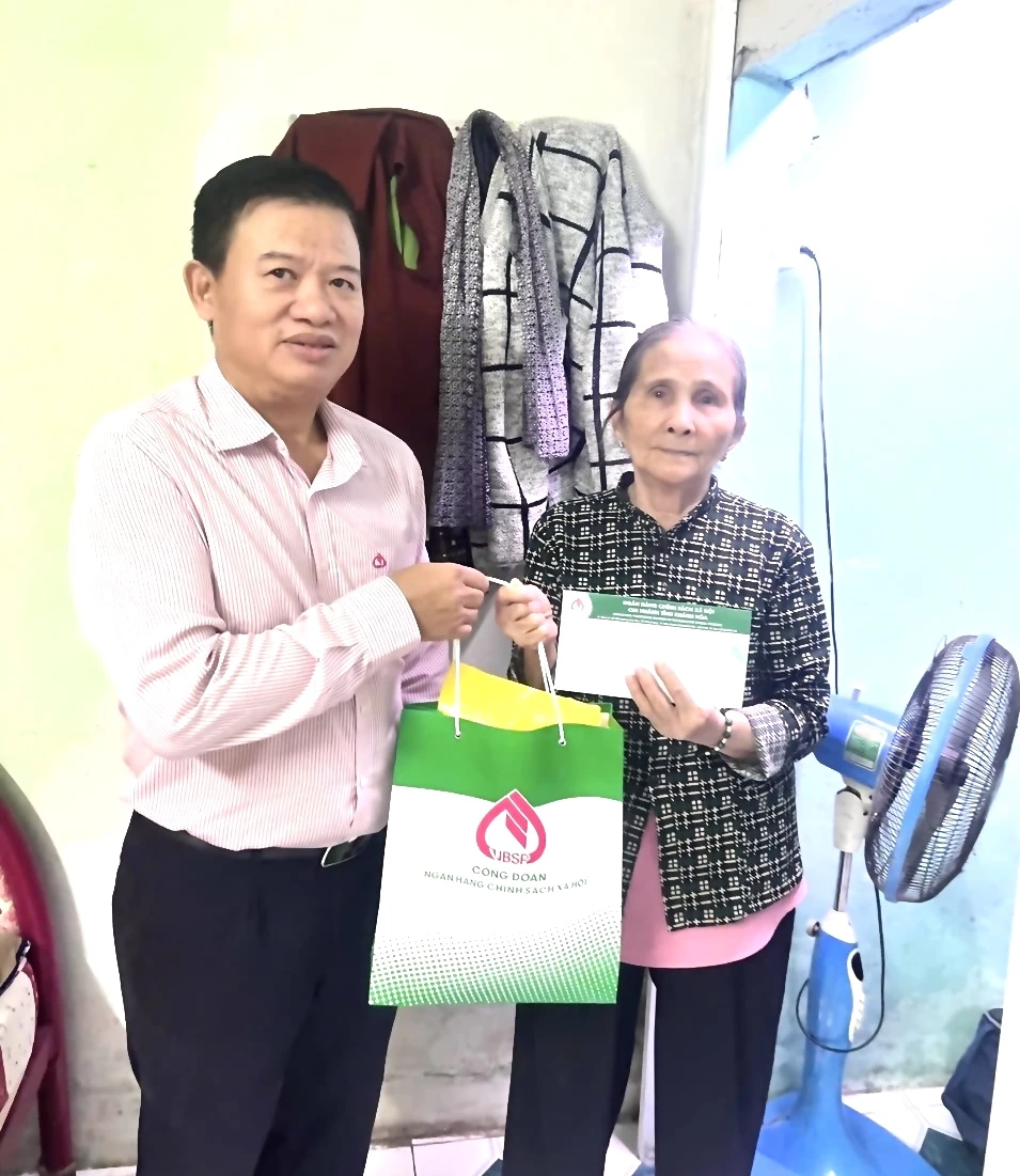 | Đại diện Công đoàn cơ sở Ngân hàng Chính sách xã hội tỉnh tặng quà cho một số hộ dân ở phường Tây Nha Trang. |