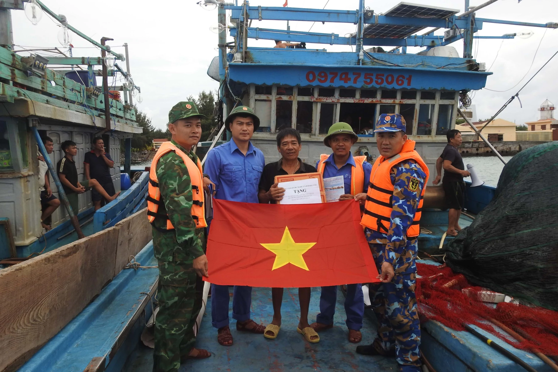 | Cán bộ, chiến sĩ đảo Đá Tây thăm hỏi, tặng cờ Tổ quốc cho ngư dân vào tránh trú bão. |