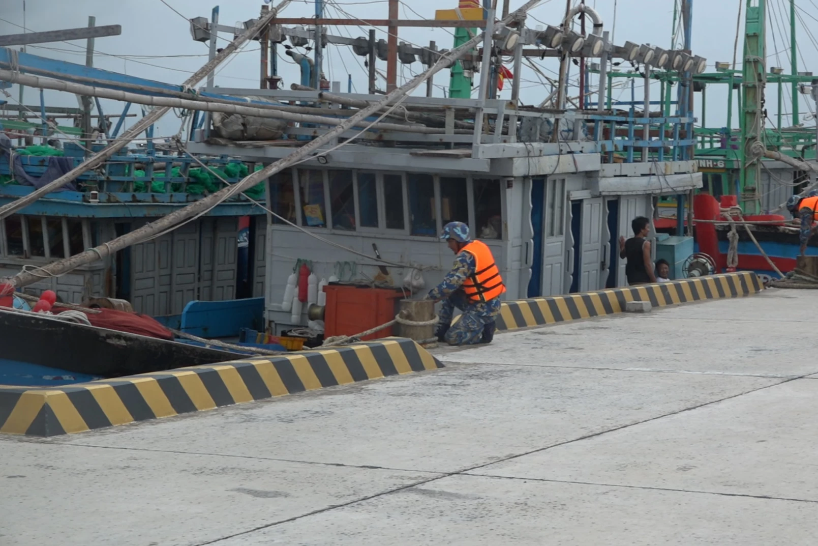 | Cán bộ, chiến sĩ đảo Sơn Ca giúp ngư dân neo đậu tàu cá. |