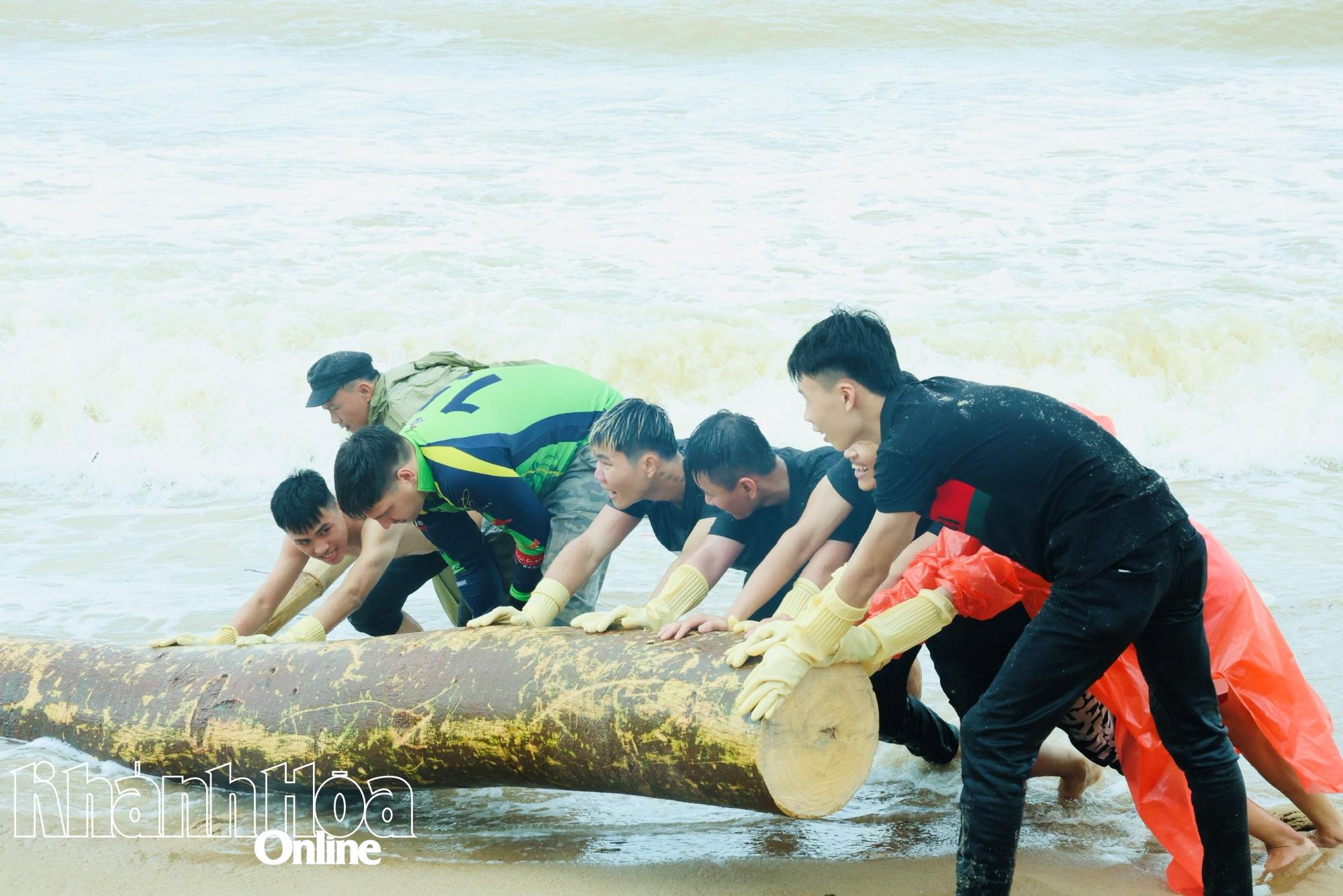 | Nhóm thanh niên cố gắng đẩy cây gỗ lớn nằm ở mép nước lên bờ. |