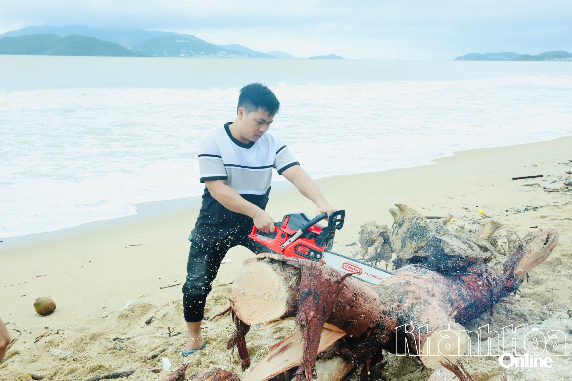 | Một thanh niên dùng cưa máy để cắt ngắn các cây to dạt vào bờ biển. |