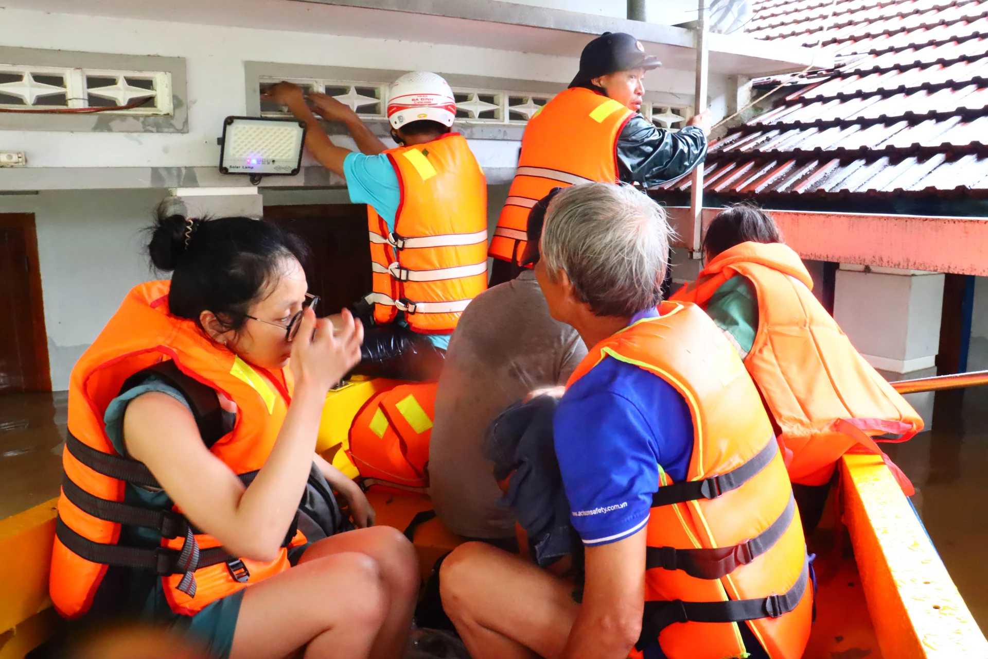 | Lực lượng cứu trợ của Học viện Hải quân tiếp cận ngôi nhà ngập gần đến mái đưa người già, trẻ em lên xuồng ra khỏi khu vực nguy hiểm. |