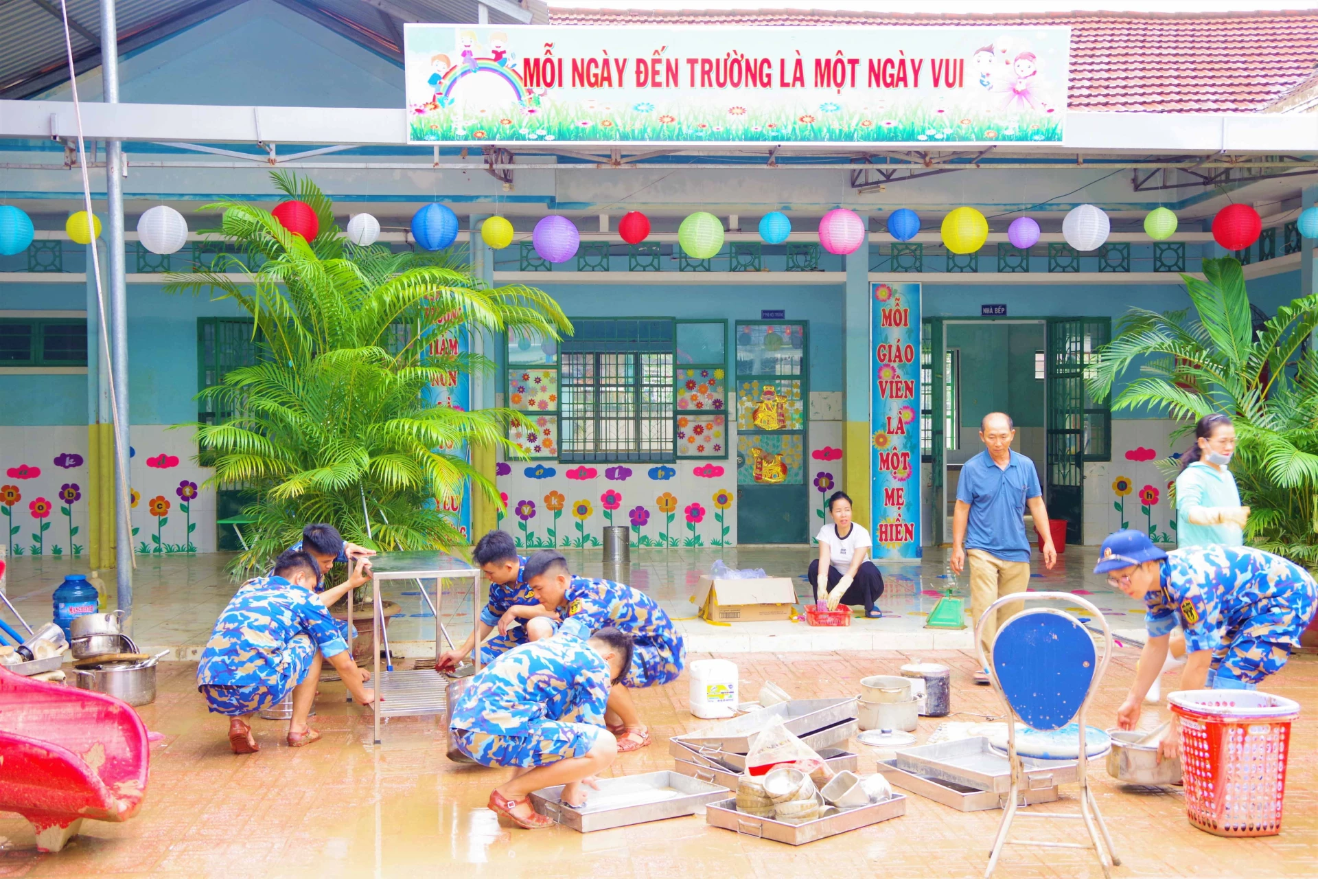 Cô Phạm Thị Kim Ngân - Hiệu phó Trường Mầm non Vĩnh Trung, phường Tây Nha Trang cho biết, trong ngày 24-11, hơn 50 học viên của Học viện Hải quân đã hỗ trợ nhà trường thu dọn bàn ghế, vét bùn, kê lại dụng cụ học tập, quét dọn sân trường, lau chùi đồ dùng học tập và dụng cụ ăn uống của các cháu. Chỉ trong một ngày, các cán bộ, học viên đã giúp đỡ nhà trường khối lượng công việc rất lớn, góp phần giúp các cháu sớm trở lại trường để học tập.