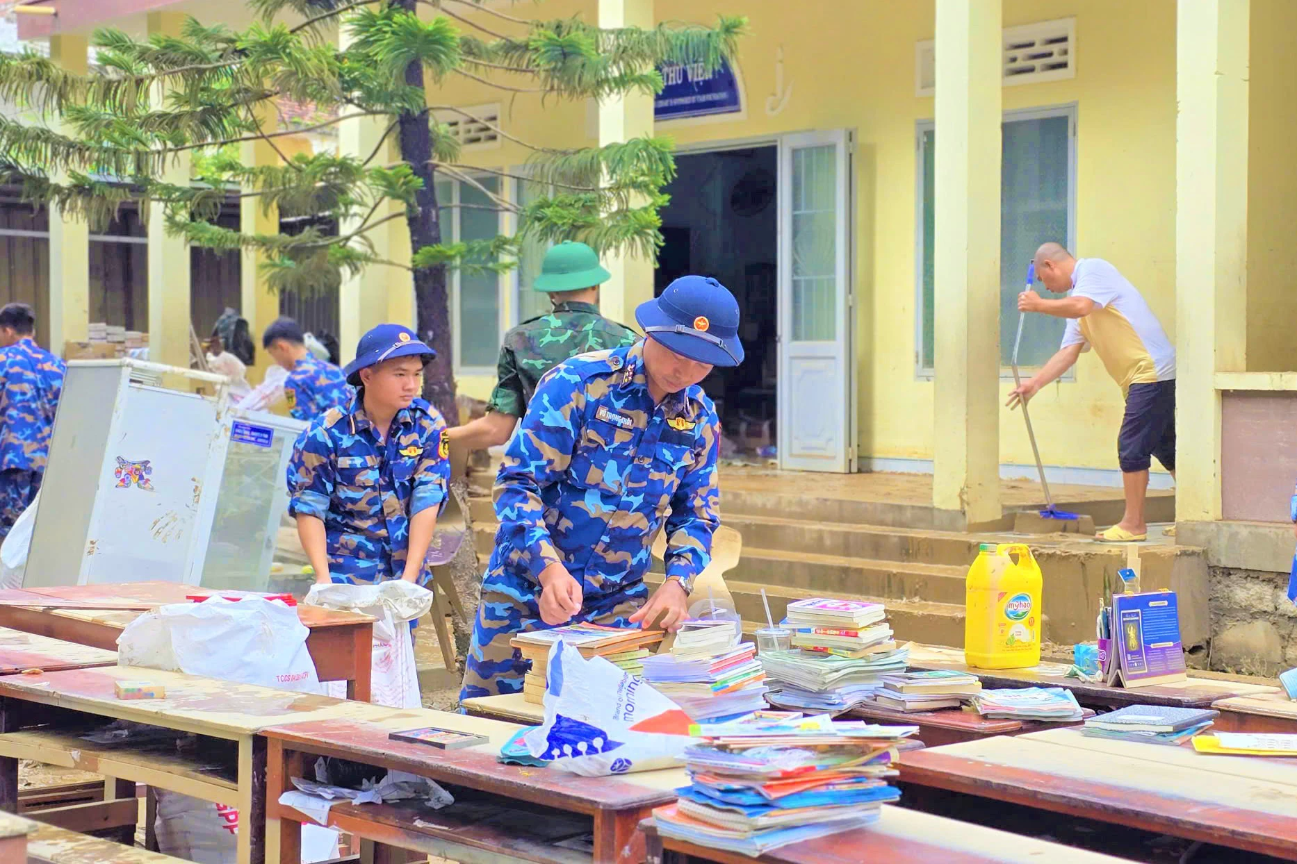 Thượng sĩ Hoàng Bình An - học viên Tiểu đoàn 2, Học viện Hải quân chia sẻ: "Sau lũ, khối lượng lớn bùn đất bị cuốn vào sân các trường học, nhưng học viên chúng tôi động viên nhau khó mấy cũng dốc sức làm. Khi thấy sân trường dần sạch lại, bàn ghế được sắp xếp ngay ngắn, chúng tôi cảm thấy rất vui vì đã làm được điều có ích cho ngôi trường để các cháu sớm đến trường”.
