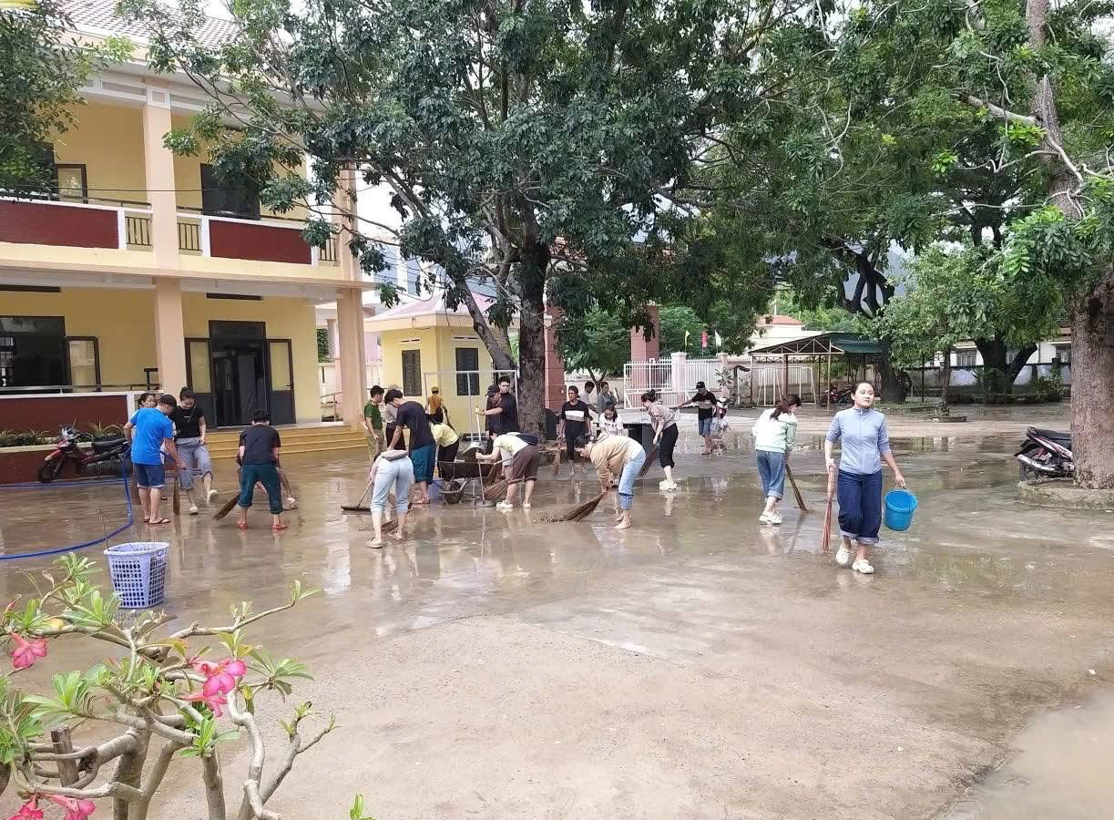 | Phụ nữ phường Ba Ngòi hỗ trợ các trường học dọn vệ sinh sau khi nước rút. |