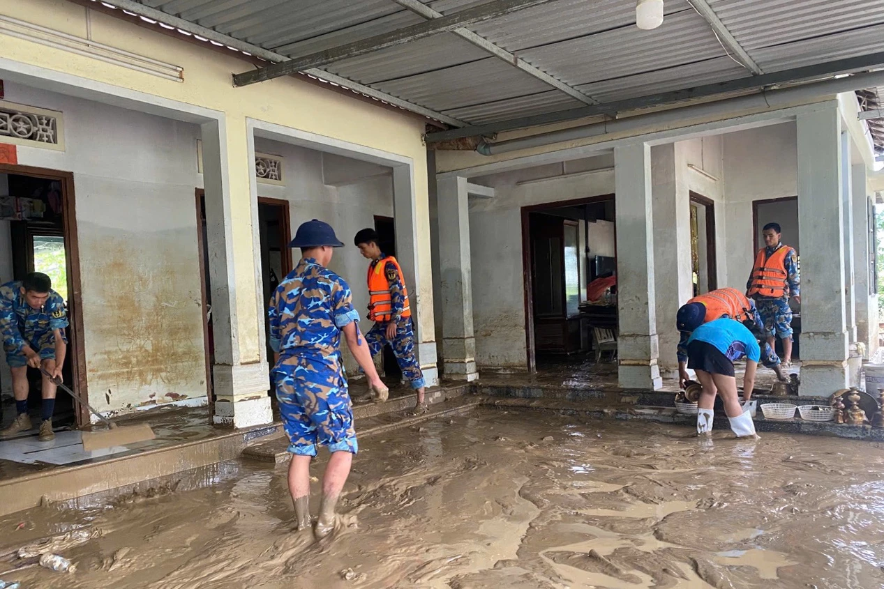 | Giúp người dân dọn vệ sinh nhà cửa sau lũ lụt. |