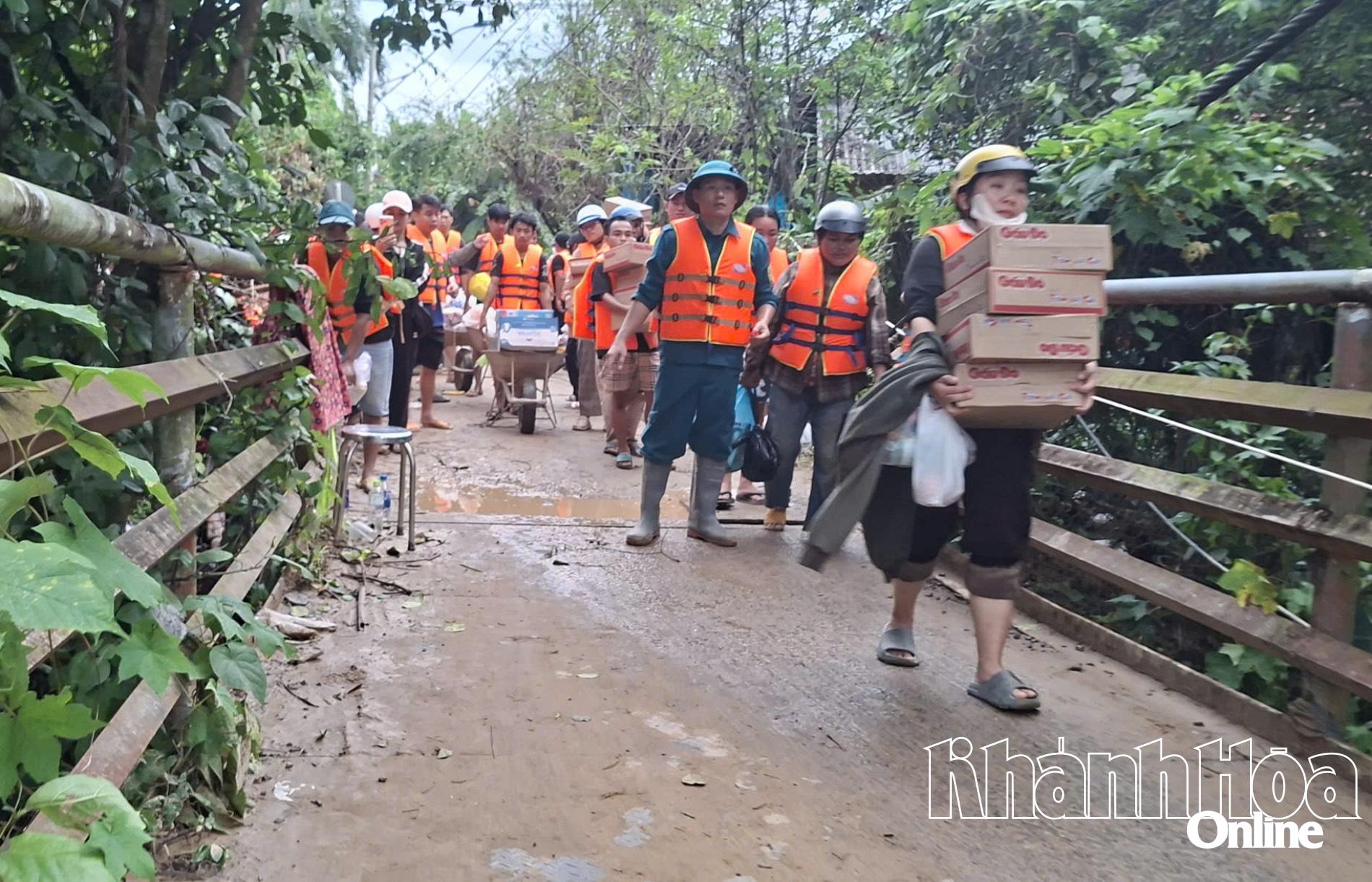 | Các lực lượng, chính quyền xã Trung Khánh Vĩnh đi trao quà cho người dân ảnh hưởng bởi mưa lũ. |
