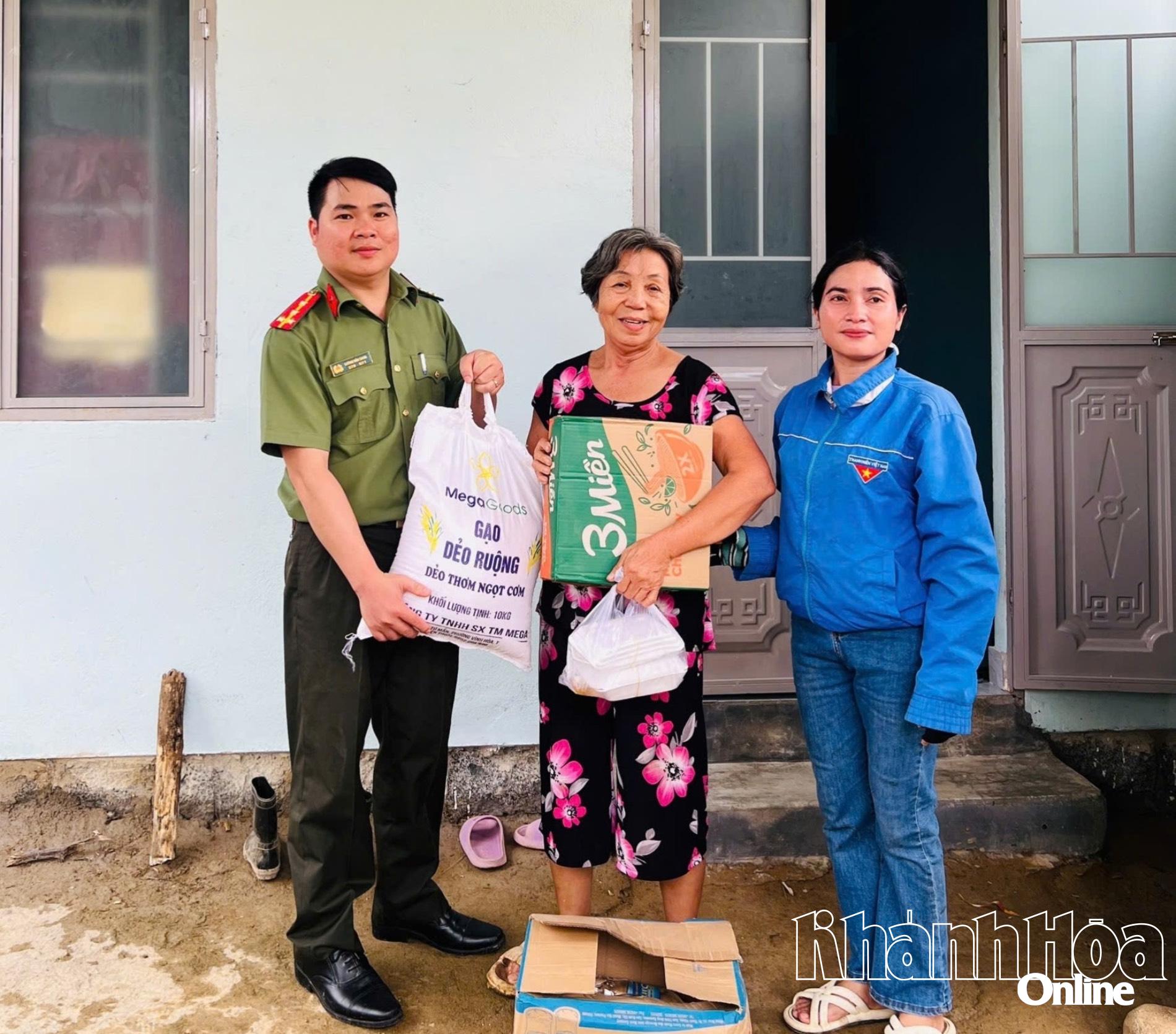 | Công an xã Trung Khánh Vĩnh trao các phần quà cho người dân bị ảnh hưởng mưa lũ. |