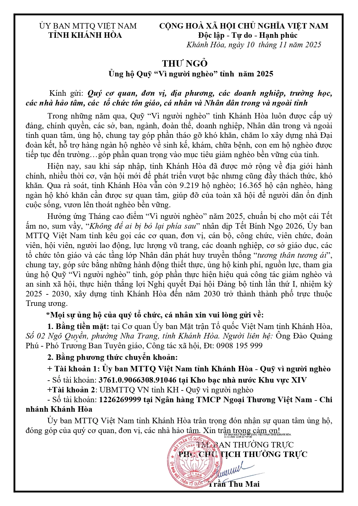 Ngày 10-11, Ủy ban MTTQ Việt Nam tỉnh Khánh Hòa gửi Thư ngỏ kêu gọi các cơ quan, đơn vị, địa phương, các doanh nghiệp, trường học, các nhà hảo tâm, các tổ chức tôn giáo, cá nhân và Nhân dân trong và ngoài tỉnh tham gia ủng hộ Quỹ "Vì người nghèo" tỉnh năm 2025.