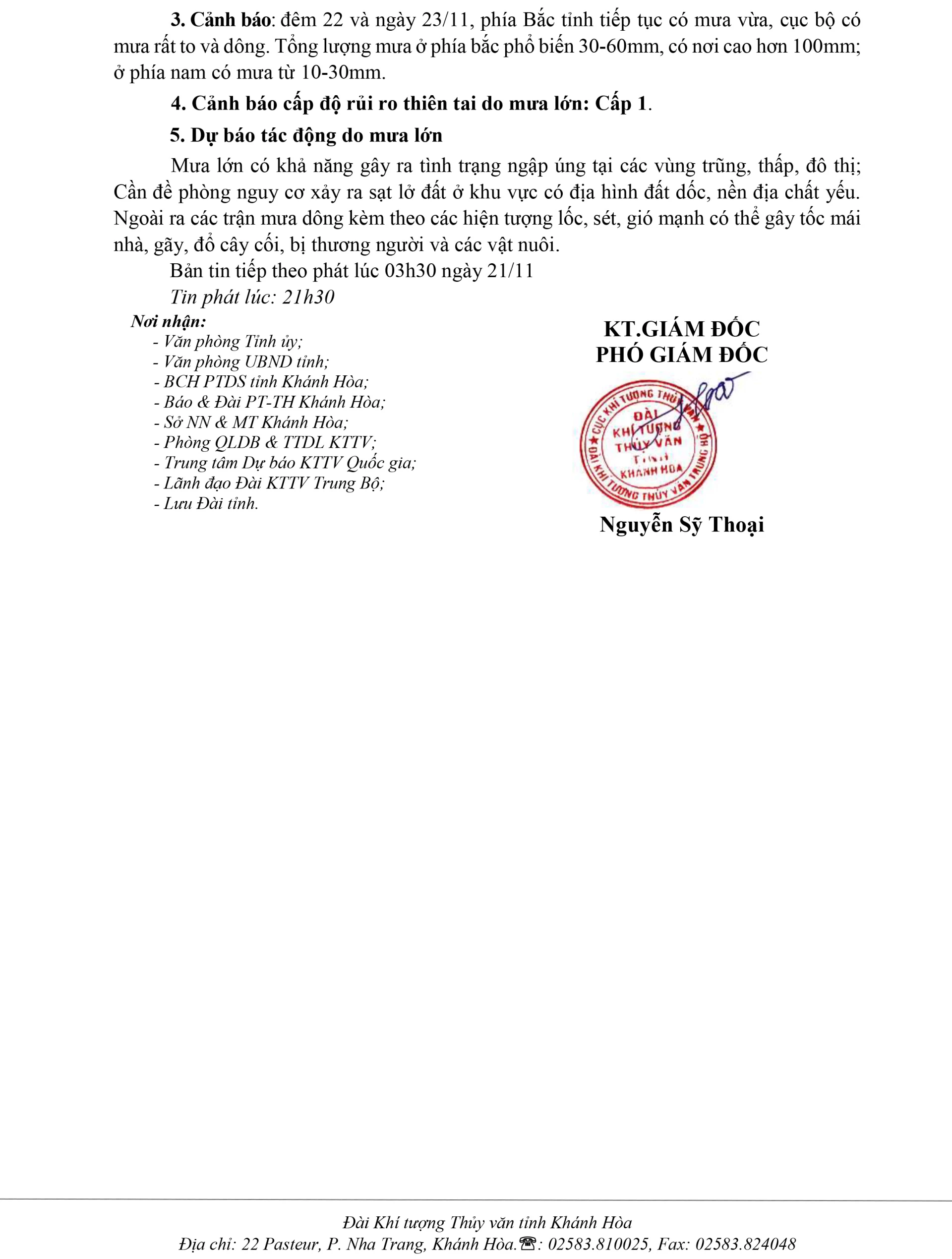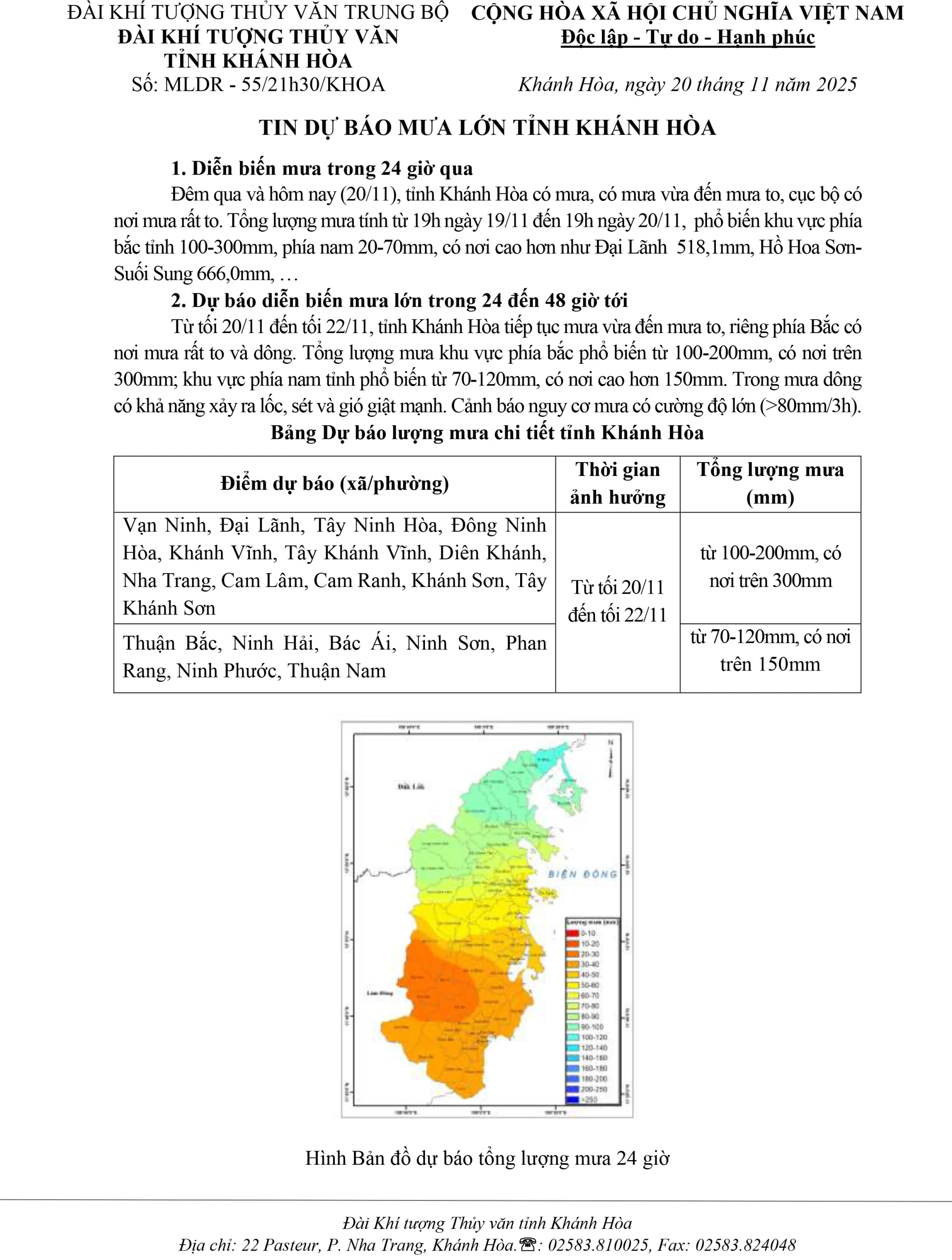 Tin dự báo mưa lớn tỉnh Khánh Hòa (tin phát lúc 21h30 ngày 20-11)