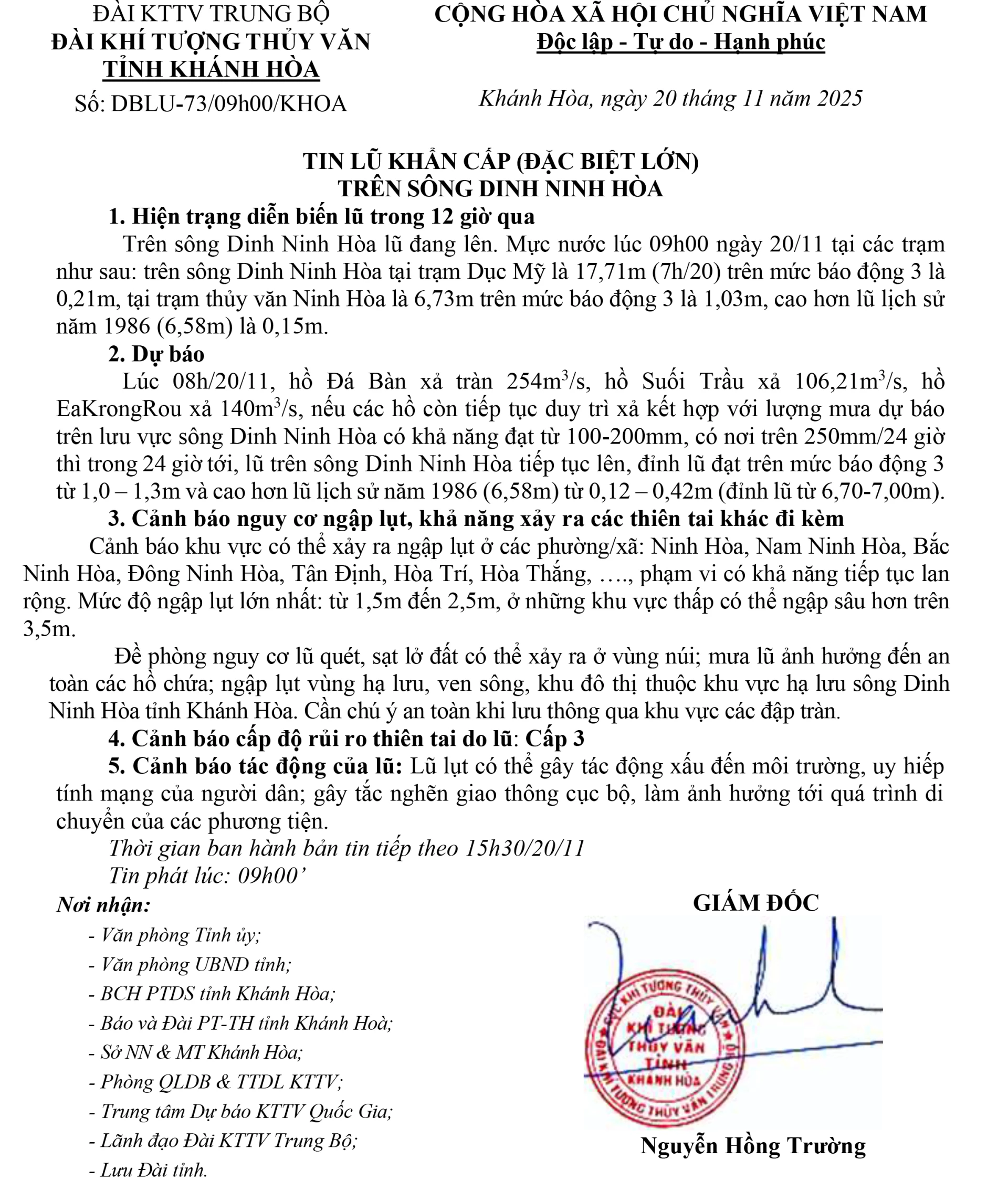 Tin lũ khẩn cấp (đặc biệt lớn) trên sông Dinh Ninh Hòa