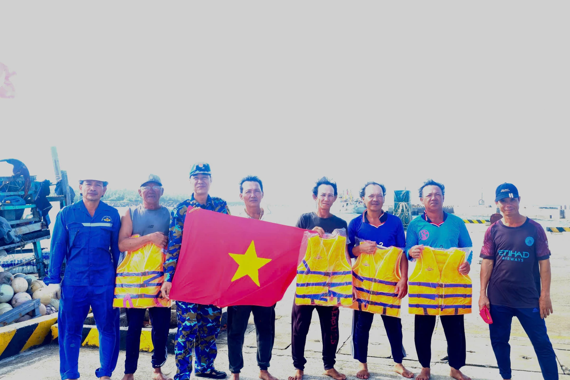 | Tặng cờ Tổ quốc và áo phao cho ngư dân. |