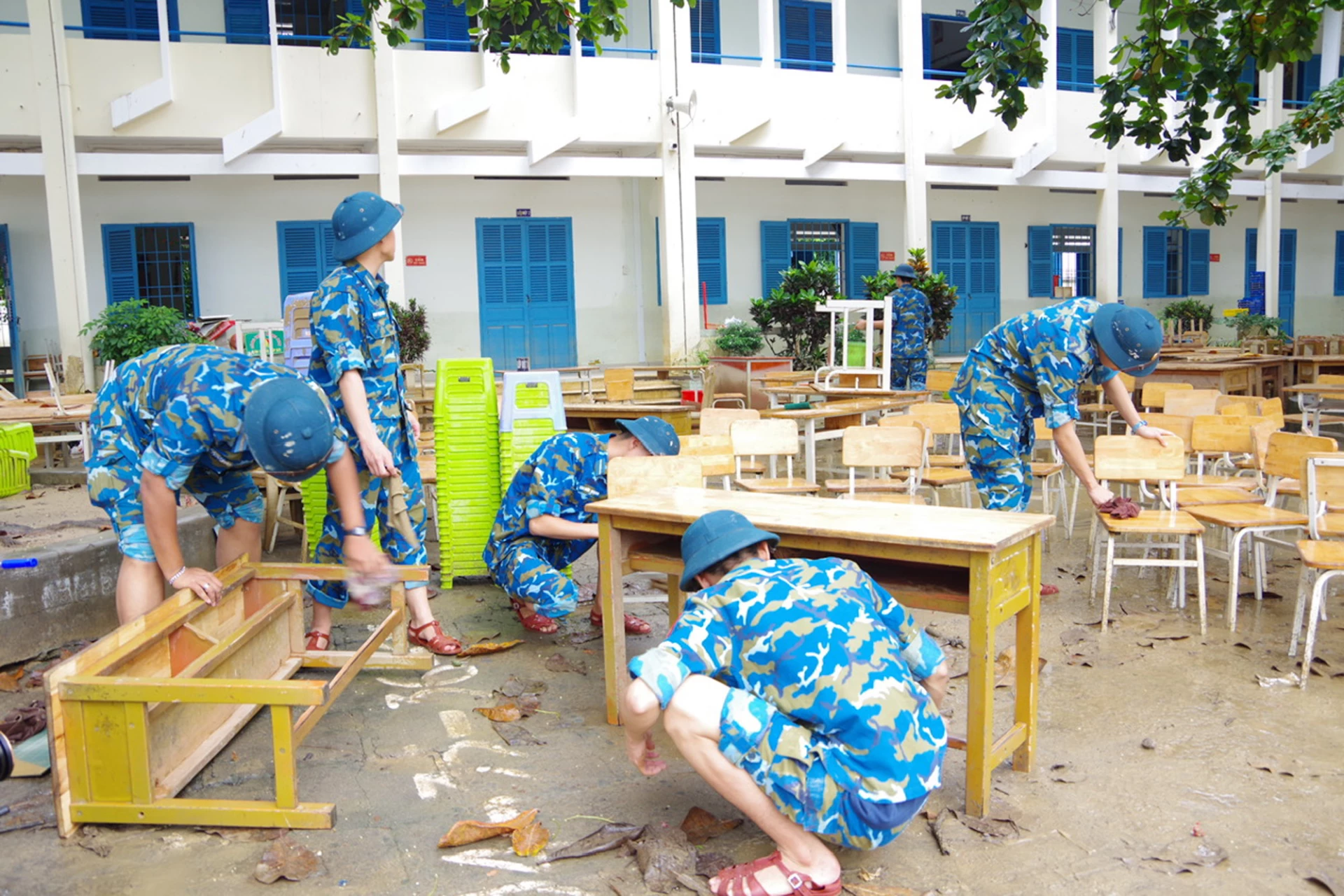 Ngày 23-11, nhà trường tiếp tục điều động 120 cán bộ, học viên, chiến sĩ đến các điểm triển khai quét dọn, khôi phục cơ sở vật chất, giúp các trường sớm ổn định dạy - học trở lại, nhân dân sớm ổn định nơi ở. Bên cạnh đó, nhà trường đã phối hợp với Ban Tuyên giáo và Dân vận Tỉnh ủy tổ chức nấu hơn 700 suất cơm tại bếp ăn Khu Hiệu bộ và bếp ăn Tiểu đoàn 1 để gửi đến nhân dân vùng lũ.