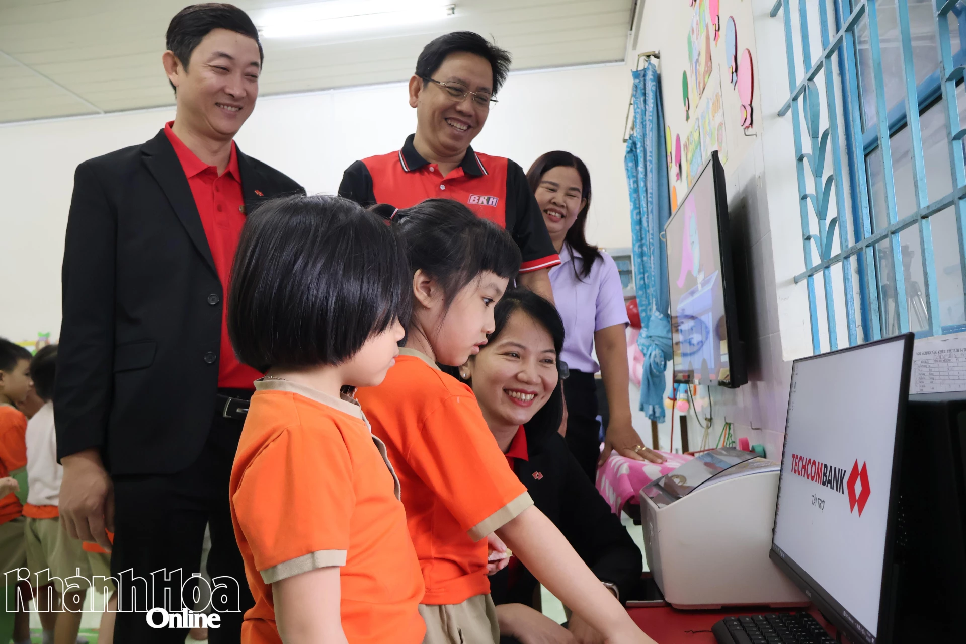| Lãnh đạo Báo và Phát thanh, Truyền hình Khánh Hòa, Techcombank và các đơn vị đồng hành cùng các cháu Trường Mầm non Vĩnh Phương 1 làm quen với máy tính mới. |