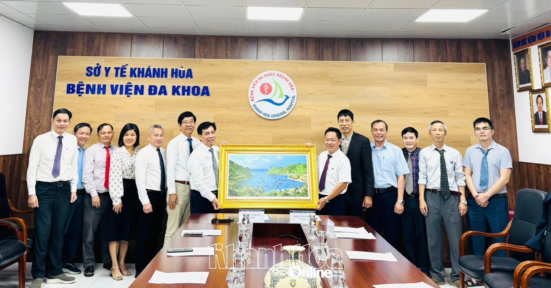 | Lãnh đạo Bệnh viện Đa khoa Khánh Hòa trao tặng bức tranh cho Bệnh viện Đa khoa Thiện Hạnh tại lễ ký kết. |
