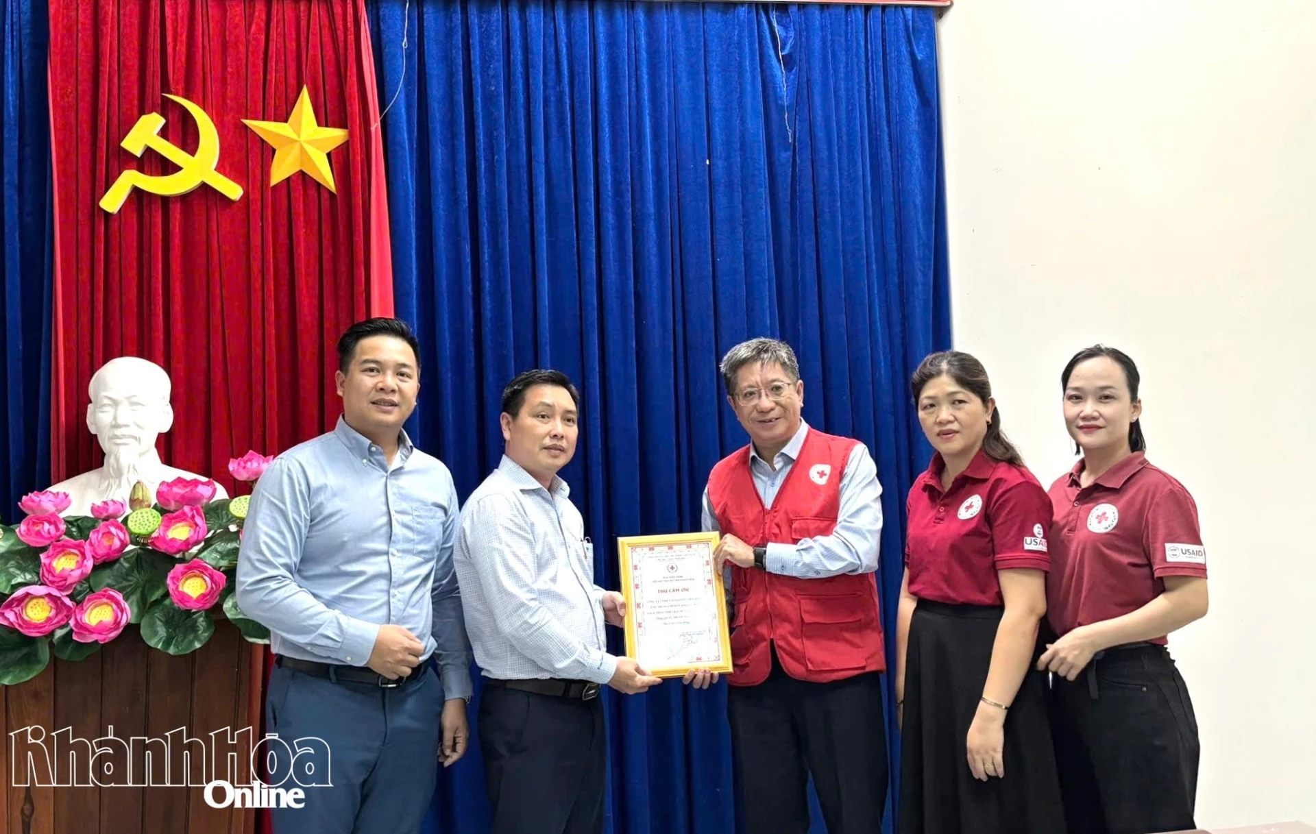 | Lãnh đạo Hội Chữ thập đỏ tỉnh trao thư cảm ơn đến đơn vị hỗ trợ. |