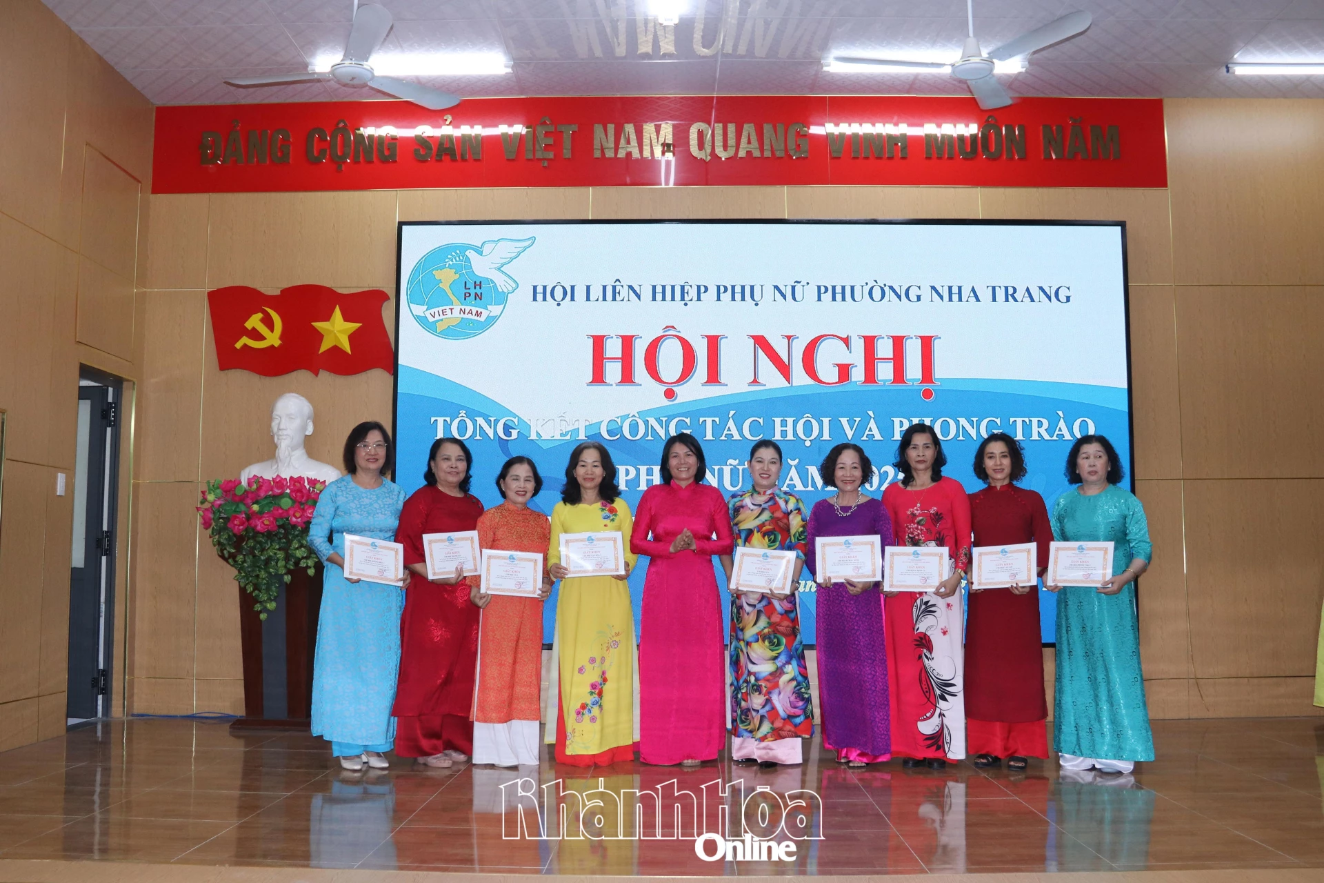 | Lãnh đạo Hội Liên hiệp Phụ nữ phường Nha Trang tặng giấy khen cho các cá nhân. |