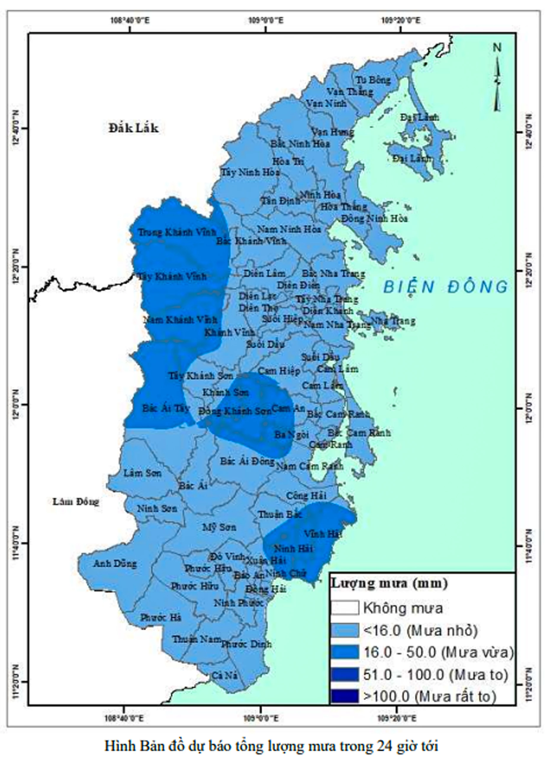 Trong 24 giờ tới, trên các sông tỉnh Khánh Hòa có dao động nhỏ. Tuy mưa không lớn, cơ quan chuyên môn vẫn cảnh báo nguy cơ lũ quét, sạt lở đất tại các xã, phường: Vạn Hưng, Vạn Thắng, Đại Lãnh, Tây Ninh Hòa, Đông Ninh Hòa, Suối Hiệp, Cam Lâm, Cam An, Suối Dầu, Bắc Khánh Vĩnh, Tây Khánh Vĩnh, Trung Khánh Vĩnh, Khánh Sơn, Đông Khánh Sơn, Tây Khánh Sơn, Lâm Sơn, Bác Ái Tây, Bác Ái, Bác Ái Đông, Ninh Sơn...