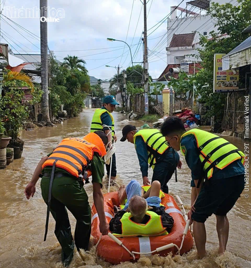 | Lực lượng chức năng phường Bắc Nha Trang di dời dân ở Tổ dân phố Trung ra khỏi khu vực bị ngập lụt. |