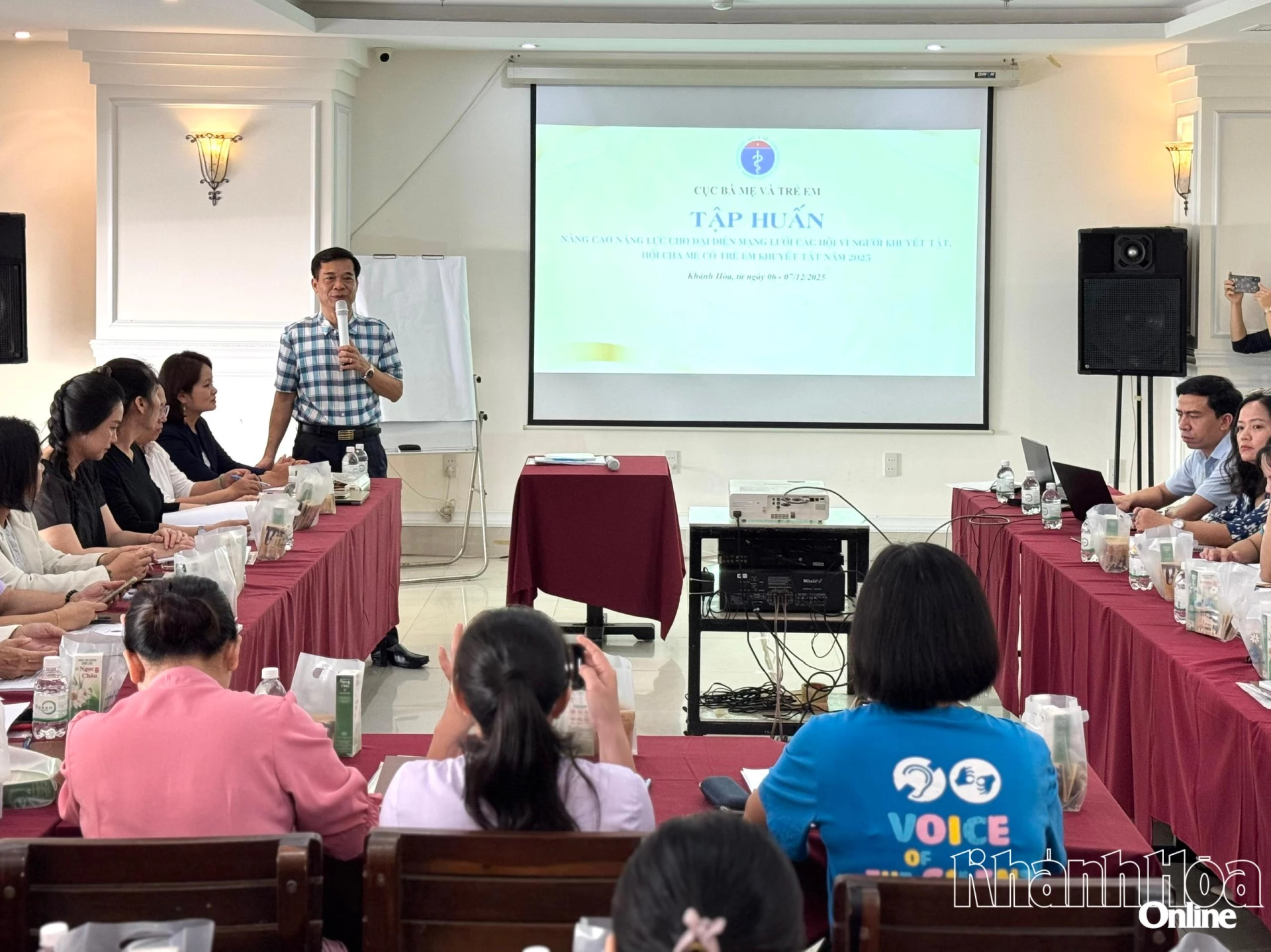 Ngày 6 và 7-12, tại tỉnh Khánh Hòa, Cục Bà mẹ và Trẻ em, Bộ Y tế tổ chức tập huấn nâng cao năng lực cho cha mẹ về bảo vệ, chăm sóc, giáo dục trẻ em khuyết tật hòa nhập cộng đồng. Tham gia lớp tập huấn có hơn 45 cán bộ thuộc Hội Bảo trợ người khuyết tật, bệnh nhân nghèo và quyền trẻ em; Hội Bảo vệ quyền trẻ em Việt Nam; Hội Cha mẹ trẻ khiếm thính và người khiếm thính Việt Nam; Hội Gia đình và trẻ em bại não Việt Nam; Hội Mạng lưới tự kỷ Việt Nam; Hội Cha mẹ trẻ em khiếm thị và các dạng tật khác (down, chậm phát triển trí tuệ...) ở các tỉnh Khánh Hòa, Đắk Lắk, Gia Lai, Lâm Đồng, Đồng Nai.