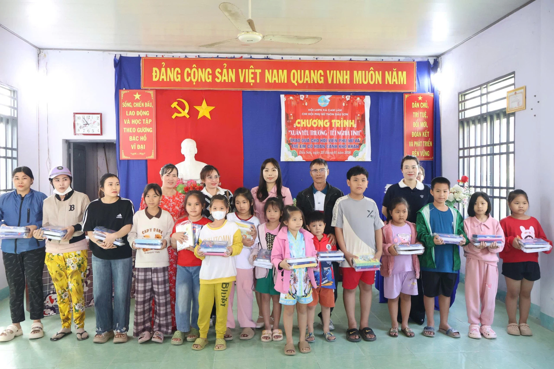 Trong chương trình, Ban tổ chức tặng 33 suất quà cho phụ nữ có hoàn cảnh khó khăn (trị giá hơn 200.000/suất, gồm các nhu yếu phẩm) và 50 suất quà cho học sinh vượt khó học tốt tại thôn Dầu Sơn (100.000 đồng/suất, gồm vở, hộp bút), do cán bộ, hội viên, phụ nữ và các mạnh thường quân hỗ trợ.