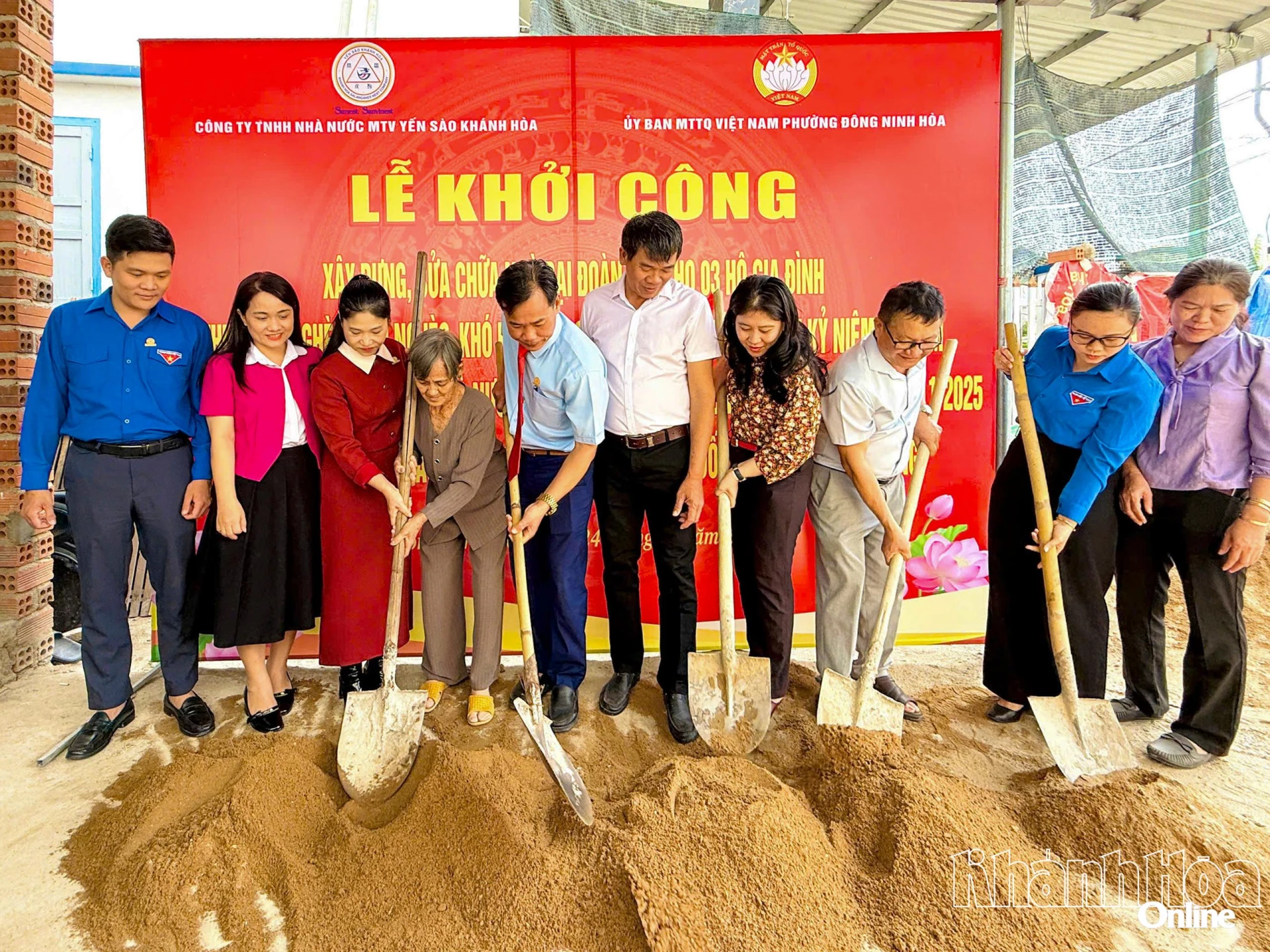 Ngày 24-1, Ủy ban MTTQ Việt Nam phường Đông Ninh Hòa phối hợp với Công ty TNHH Nhà nước Một thành viên Yến sào Khánh Hòa tổ chức lễ khởi công xây dựng, sửa chữa nhà Đại đoàn kết cho 3 hộ dân trên địa bàn gồm: Bà Nguyễn Thị Sậy (Tổ dân phố 7 Bình Tây), ông Hồ Văn Đùm (Tổ dân phố Mỹ Giang) và ông Nguyễn Văn Trầm (Tổ dân phố Ninh Tịnh).