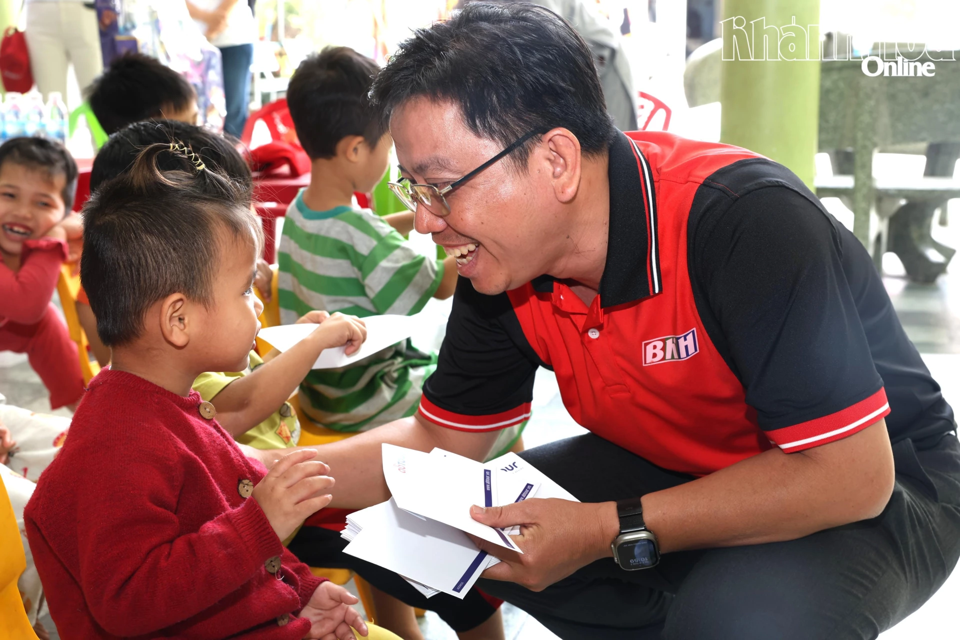 | Ông Cung Phú Quốc tặng quà cho các em nhỏ ở Mái ấm chùa Phật Bửu. |