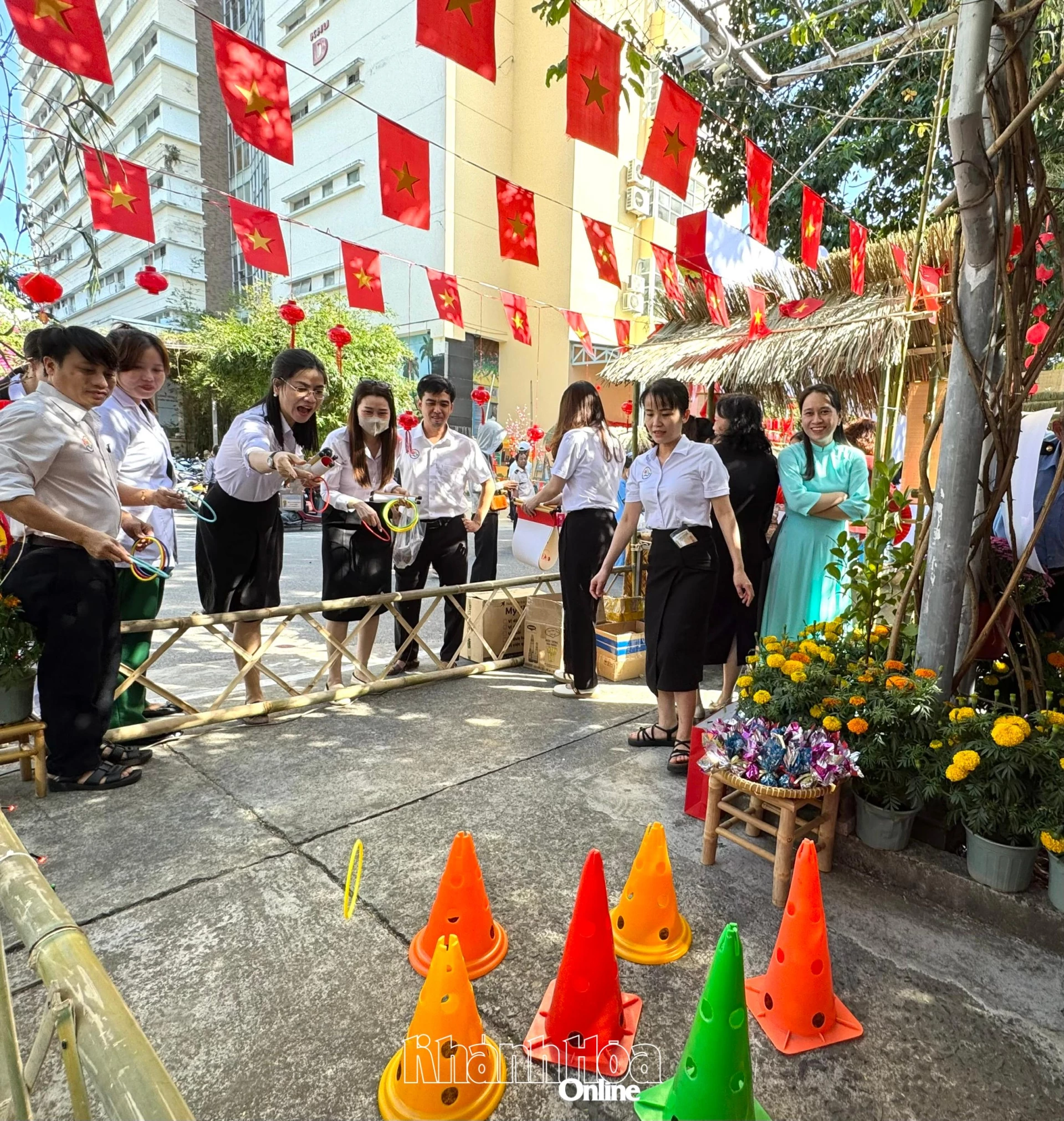 | Nhân viên y tế của bệnh viện tham gia trò chơi tại Chợ Tết công đoàn. |