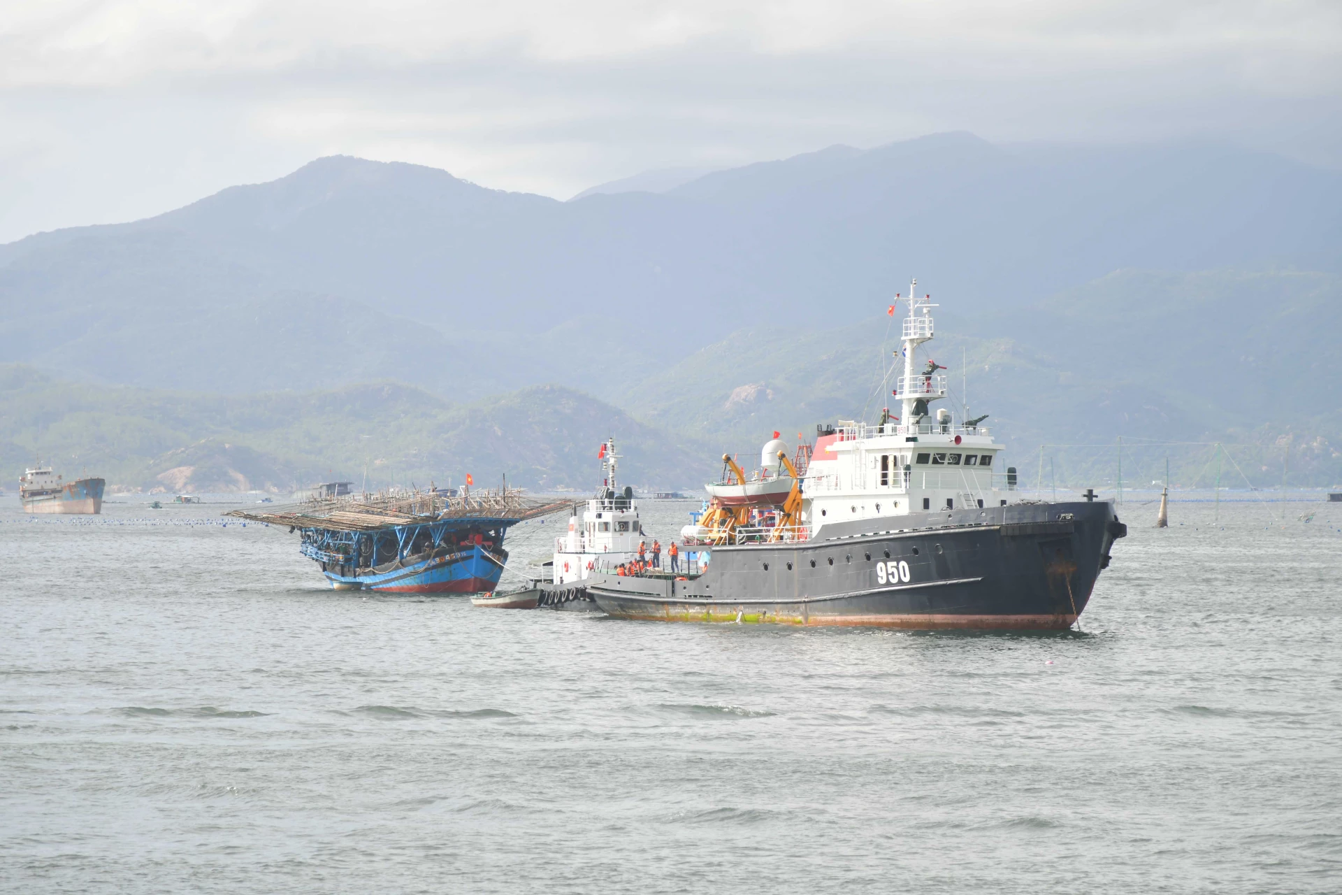 | Tại khu vực cảng Ba Ngòi, tàu 950 bàn giao tàu cá cho tàu 986 để lai dắt tàu cá cập cảng. |