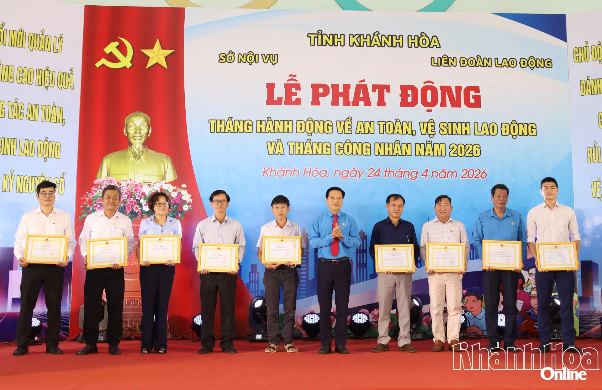 Ngày 24-4, tại Khu Công nghiệp Suối Dầu (xã Cam Lâm), Sở Nội vụ phối hợp với Liên đoàn Lao động tỉnh Khánh Hòa tổ chức lễ phát động Tháng hành động về an toàn, vệ sinh lao động (ATVSLĐ) và Tháng Công nhân năm 2026 với chủ đề “Đổi mới và nâng cao hiệu quả công tác ATVSLĐ trong kỷ nguyên số”. Tham dự buổi lễ có lãnh đạo Ban Nội chính Tỉnh ủy, Ban Tuyên giáo và Dân vận Tỉnh ủy, Sở Nội vụ, Liên đoàn Lao động tỉnh, cùng 450 đoàn viên công đoàn, người lao động đến từ các cơ quan, đơn vị, doanh nghiệp trên địa bàn tỉnh.