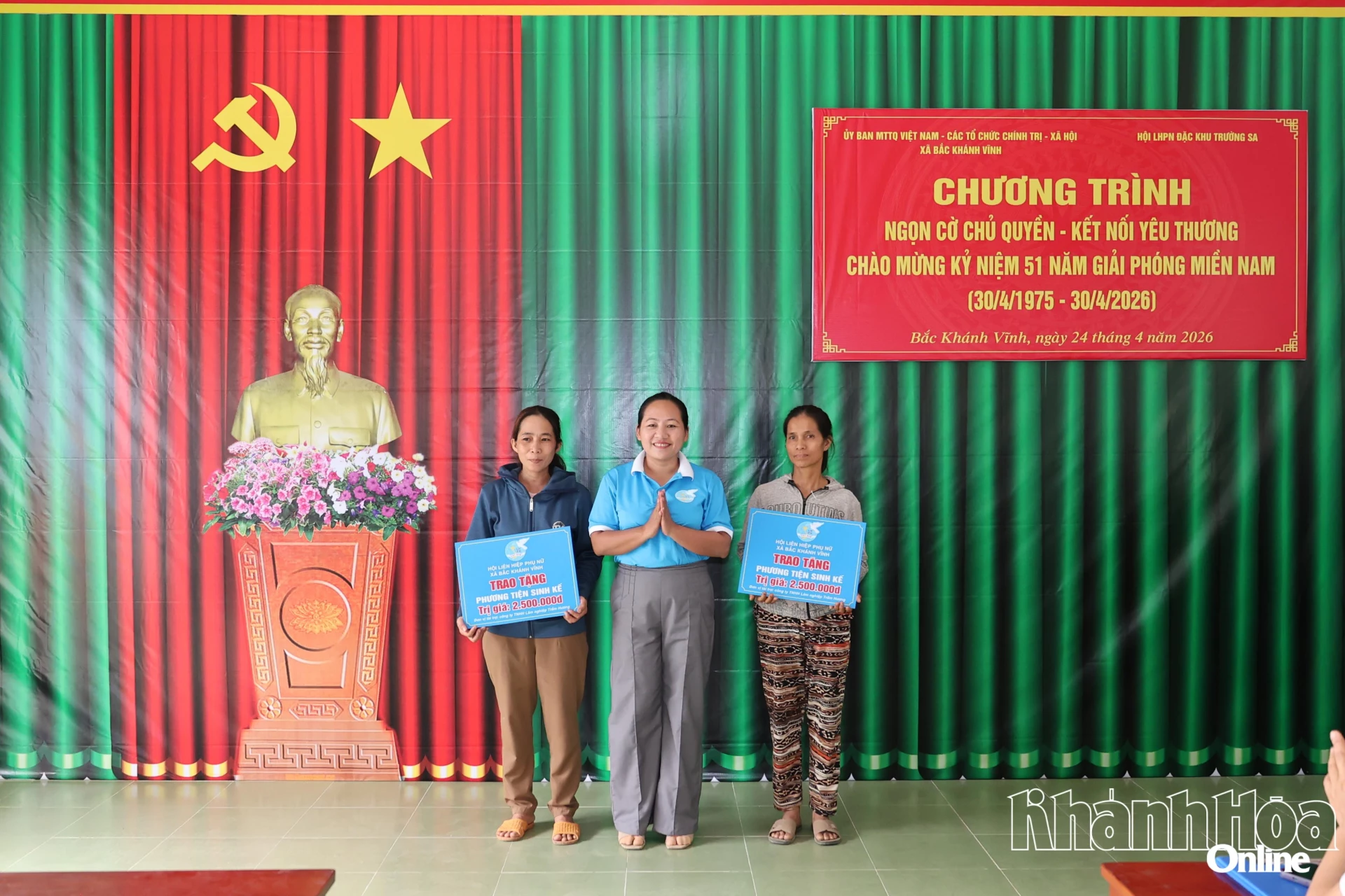 | Hội Liên hiệp Phụ nữ xã Bắc Khánh Vĩnh trao biểu trưng phương tiện sinh kế cho 2 hội viên có hoàn cảnh khó khăn. |