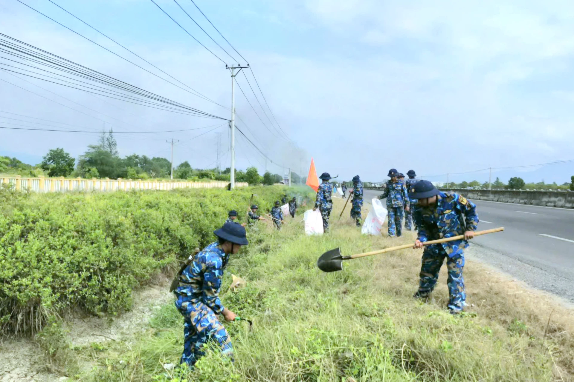 | Cán bộ, đoàn viên dọn vệ sinh dọc Quốc lộ 1. |