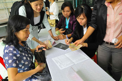 | Các thí sinh làm thủ tục đăng ký dự tuyển. |