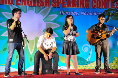 | Học sinh biểu diễn văn nghệ bằng tiếng Anh tại Trường THCS Thái Nguyên. |