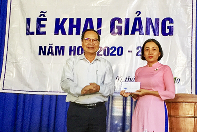 Đại diện nhà trường tiếp nhận hỗ trợ từ Hội Bảo trợ người khuyết tật - trẻ em mồ côi và bệnh nhân nghèo tỉnh. |