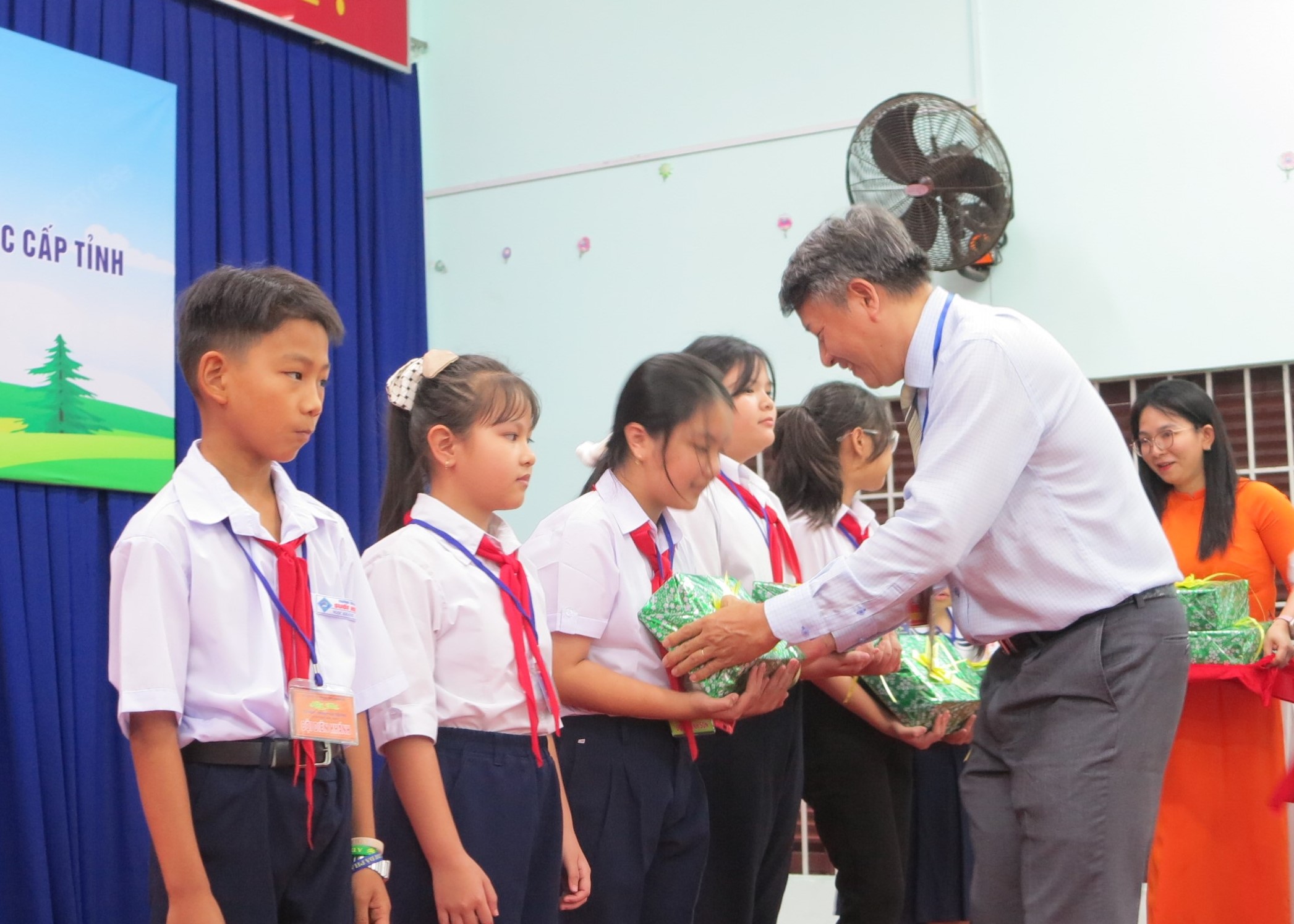 | Ông Hà Văn Thông - Trưởng phòng Giáo dục mầm non - Giáo dục tiểu học Sở Giáo dục và Đào tạo trao quà cho các thí sinh. |