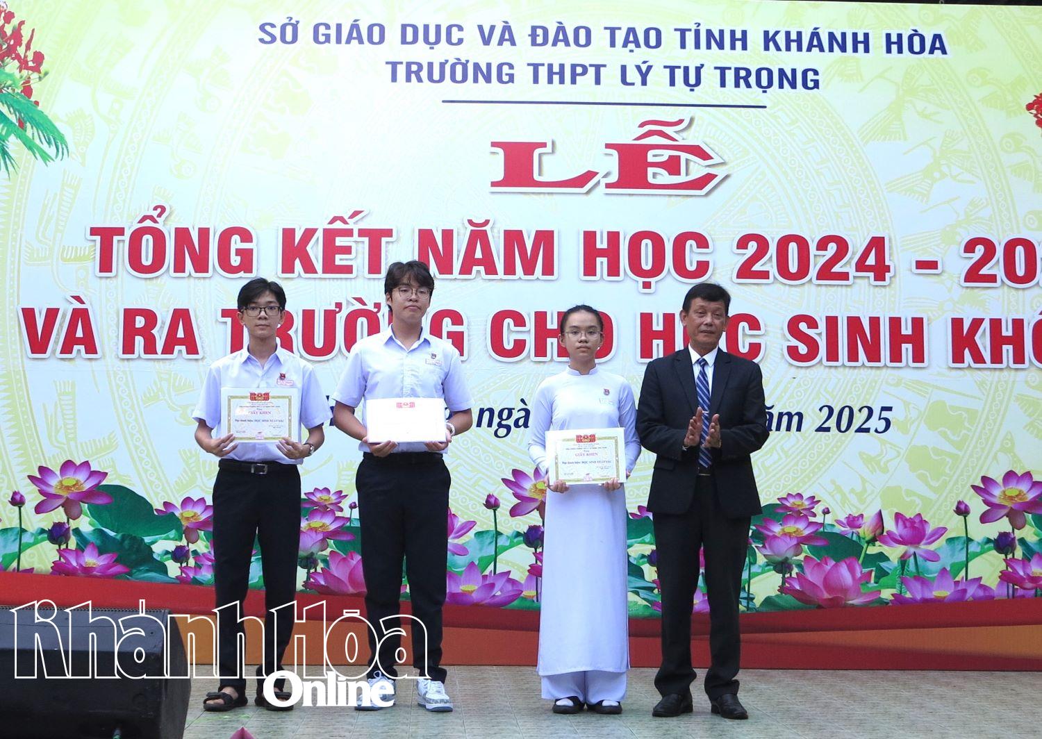 | Lãnh đạo nhà trường trao giấy khen cho các học sinh xuất sắc nhất khối 10, 11 và 12. |