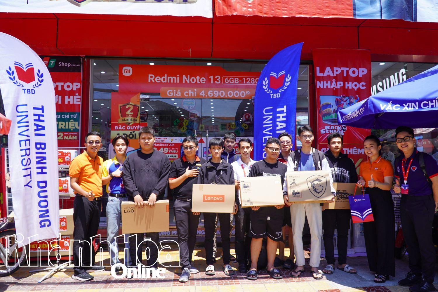 | Đại diện nhà trường tặng laptop cho thí sinh đăng ký nguyện vọng 1 vào trường. |