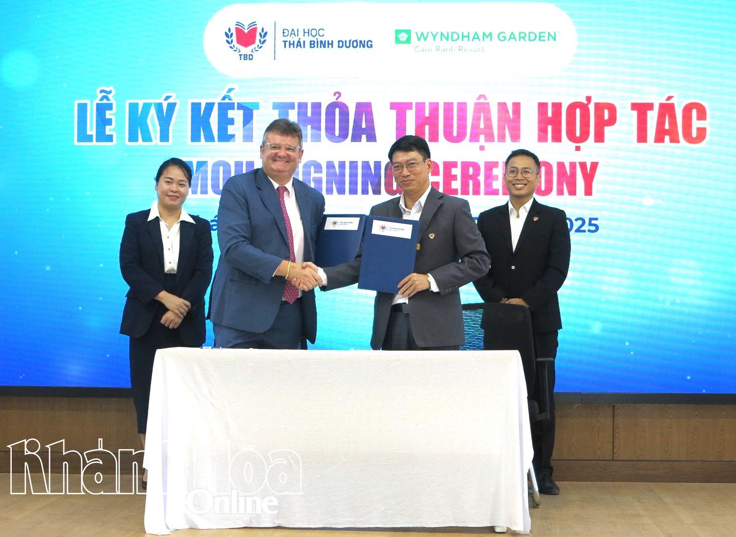 | Đại diện Trường Đại học Thái Bình Dương và Wyndham Garden Cam Ranh Resort ký kết hợp tác. |